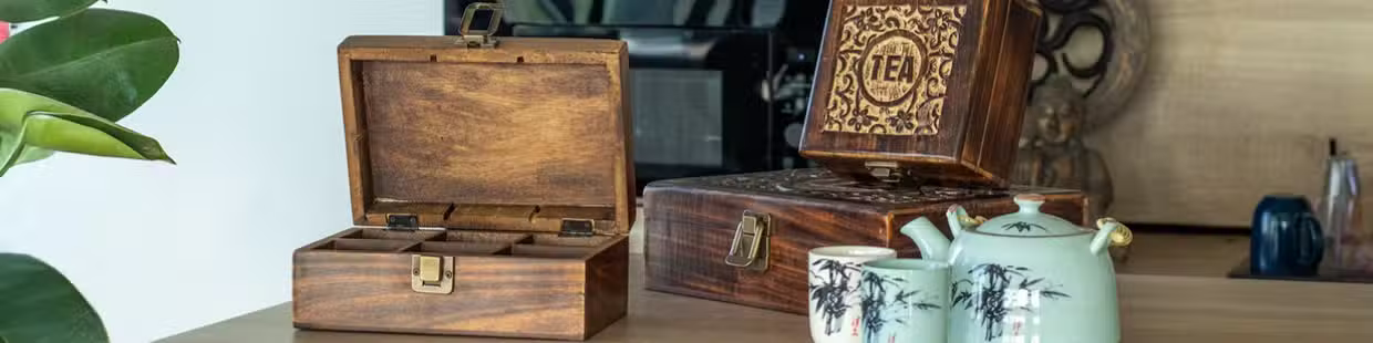 Diese Teeaufbewahrungsboxen werden von erfahrenen Kunsthandwerkern in Indien aus nachhaltigem Mangoholz handgefertigt, das für seine Haltbarkeit und wunderschöne, einzigartige Maserung bekannt ist.