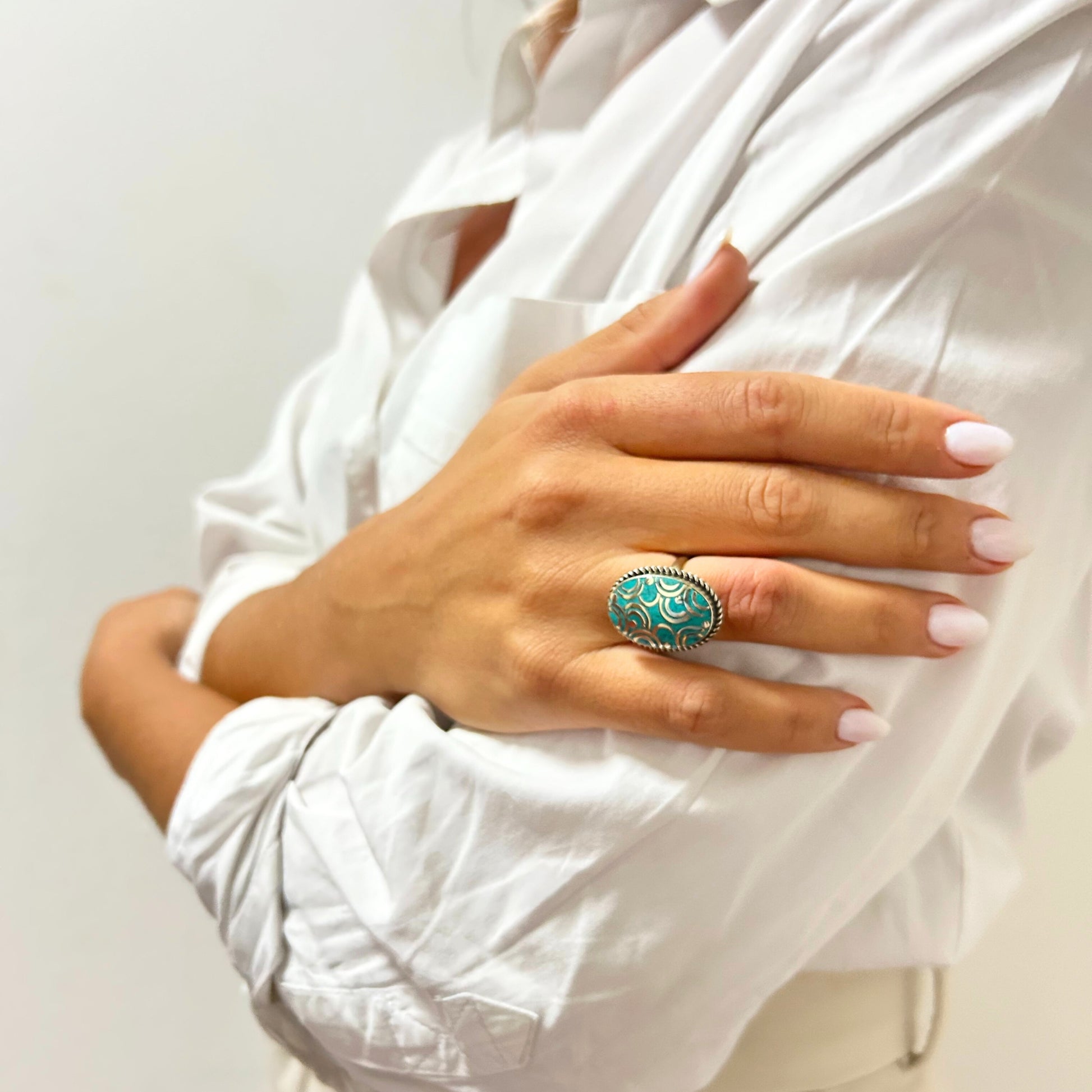 Ideal für alle, die ethnische Mode und bedeutungsvolle Handarbeit schätzen, verleihen diese Ringe jedem Outfit eine einzigartige Note. Sie eignen sich perfekt zum Kombinieren oder einzeln und passen sowohl zu lässigen als auch zu formellen Outfits. Mit den 4 ovalen Ringen im nepalesischen Stil (4 Farben) erhalten Sie nicht nur ein Accessoire, sondern auch eine Geschichte von Tradition und Kunst.