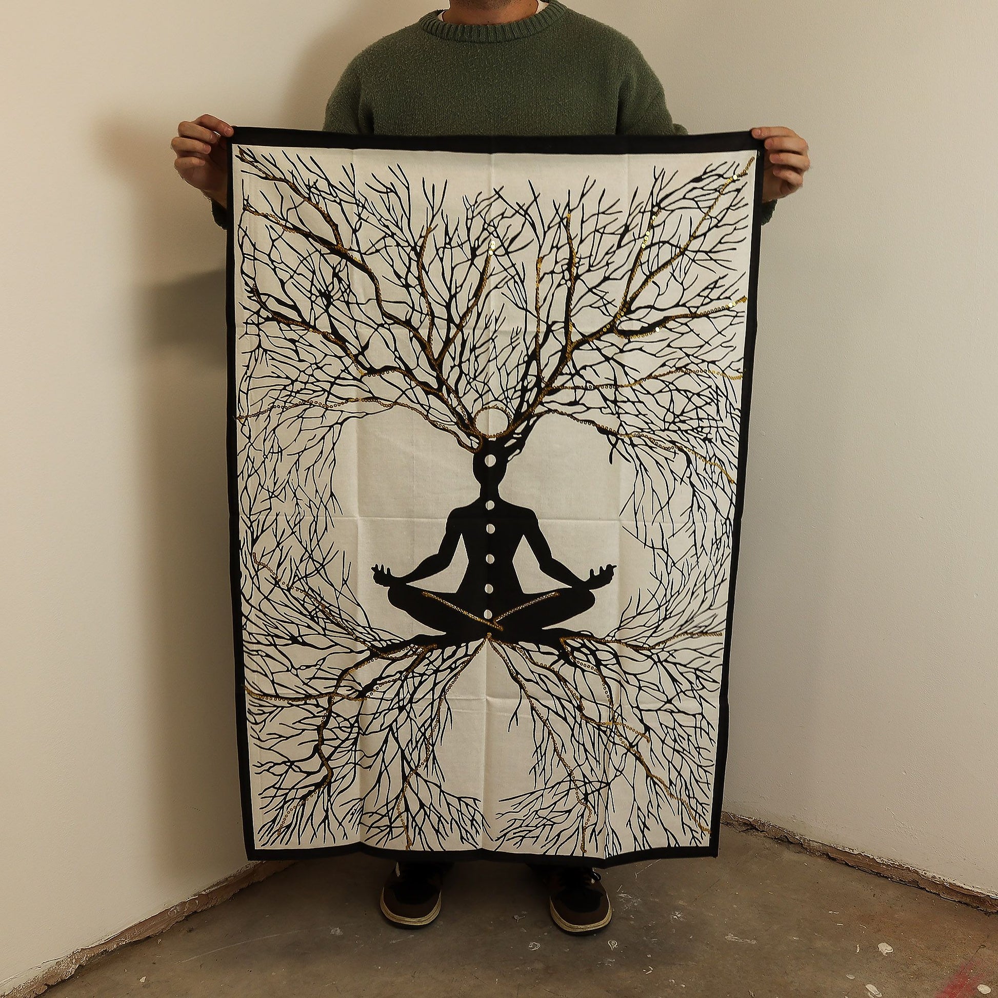 Hecha en India y con un tamaño de 70 x 110 cm, esta pieza de algodón ligero es fácil de colgar y queda muy bien en salas de yoga, rincones de meditación, espacios creativos o dormitorios. Las ramas que fluyen, la postura centrada y los sutiles puntos de chakra crean una sensación de equilibrio y conexión con la naturaleza.