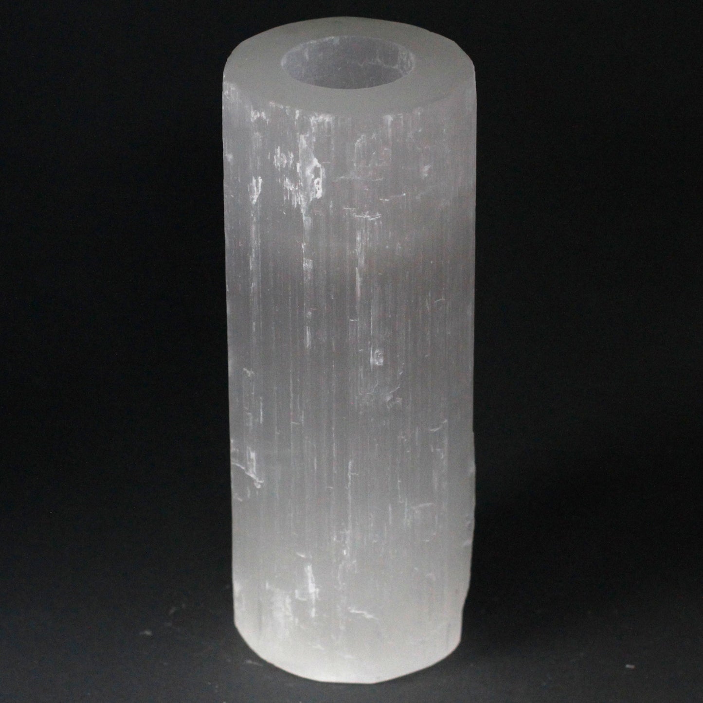 - Selenit ist ein durchscheinender Kristall, der die Kerzenflamme durch die Wände des Kerzenhalters flackern lässt.