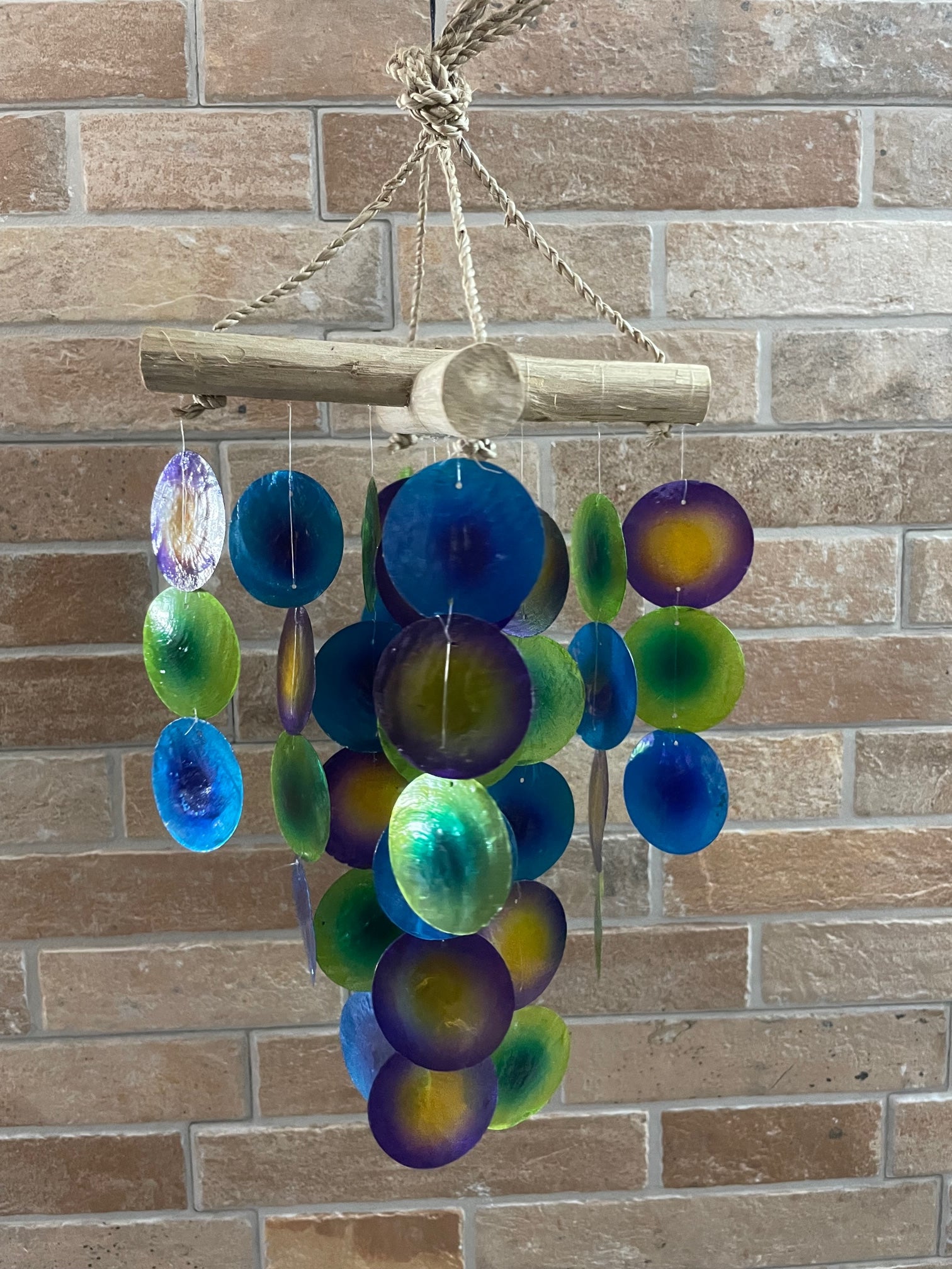 Die sorgfältige Herstellung dieses Glockenspiels gewährleistet nicht nur seine ästhetische Schönheit, sondern auch seinen sanften Klang und schafft so eine beruhigende Atmosphäre in Häusern, Gärten oder Meditationsräumen. Die Farbkombination wurde sorgfältig ausgewählt, um jedes Dekor zu ergänzen und ein subtiles und dennoch markantes Designelement zu schaffen.