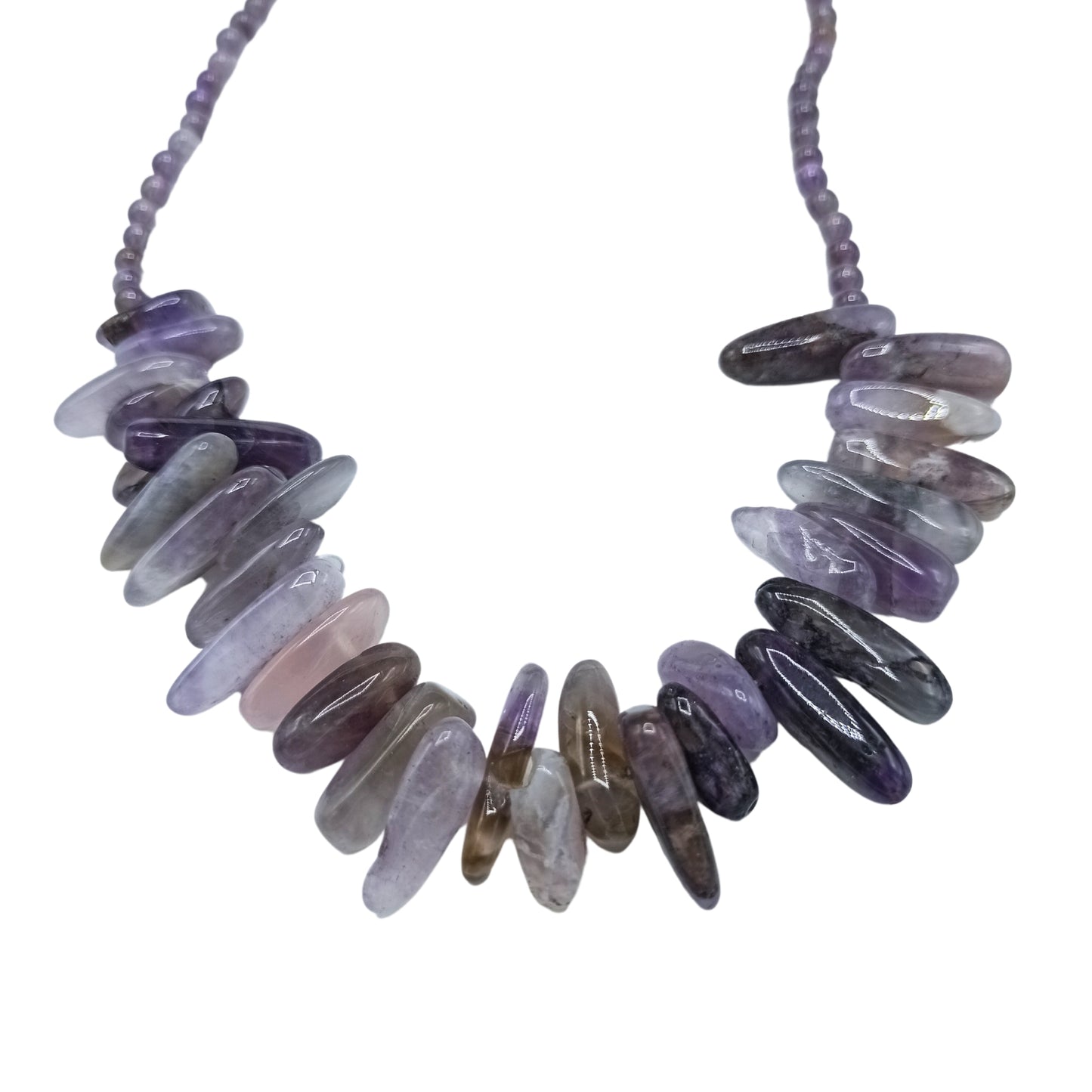 Hüllen Sie Ihren Hals in die Eleganz und Gelassenheit, die die lange Edelsteinkette mit Amethyst ausstrahlt. Dieses einzigartige Schmuckstück wurde sorgfältig zusammengestellt, um die Essenz und Schönheit des Amethysts einzufangen, eines Edelsteins, der für seine Fähigkeit bekannt ist, Ruhe und geistige Klarheit zu fördern. Jeder Stein wurde nach seiner Qualität und Farbe ausgewählt, sodass Sie ein Accessoire erhalten, das nicht nur durch sein Design, sondern auch durch seine Bedeutung besticht.
