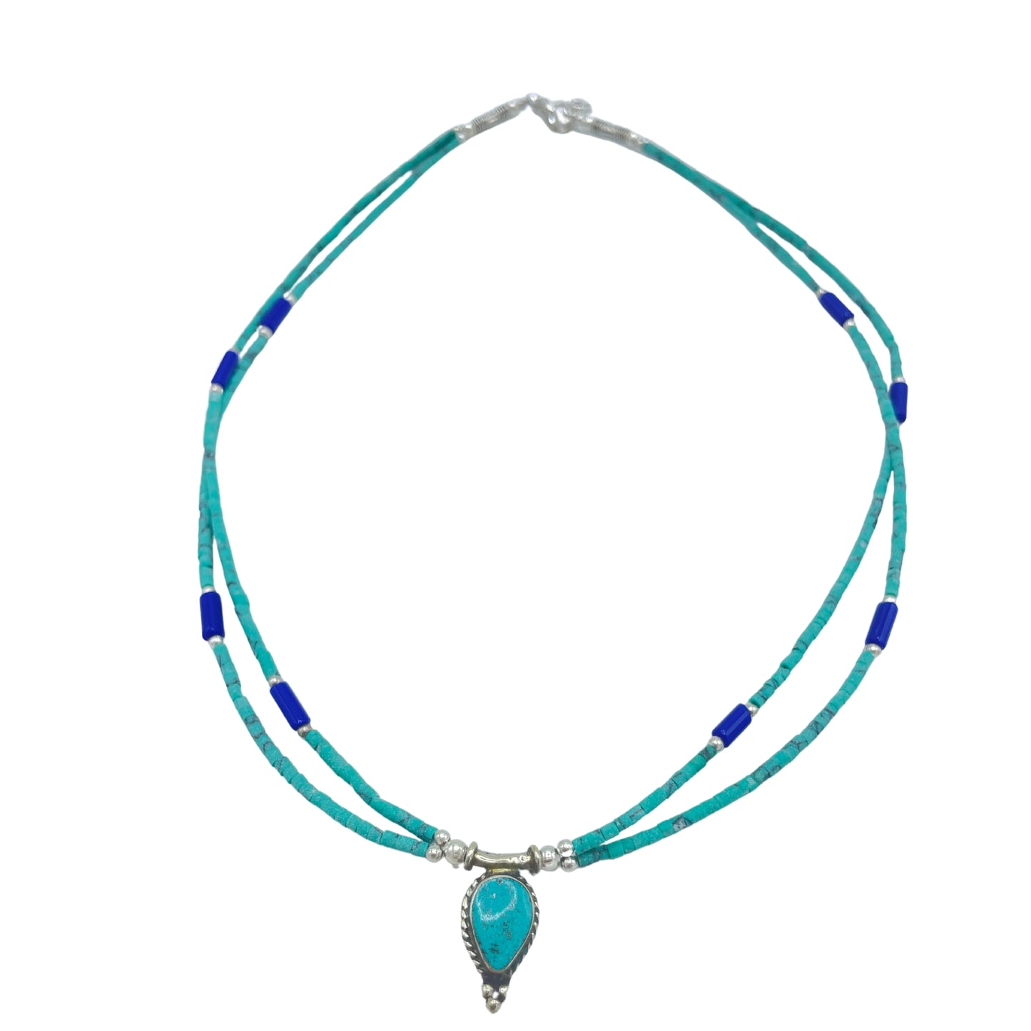 Extra dünne zweireihige nepalesische Halskette - Anhänger aus Lapislazuli und Malachit