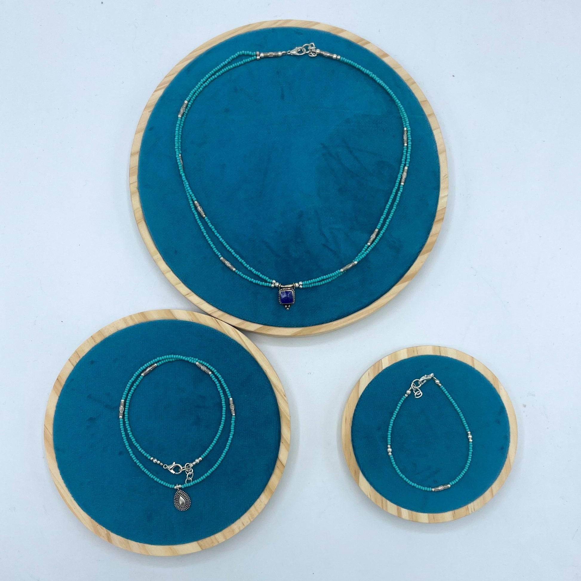 Hüllen Sie Ihren Hals in die Magie und Eleganz der extrafeinen zweireihigen nepalesischen Halskette mit Türkis- und Lapislazuli-Anhänger . Ein einzigartiges Schmuckstück, das traditionelle nepalesische Handwerkskunst mit der Schönheit natürlicher Edelsteine verbindet. Diese Halskette ist ein zeitloses Schmuckstück, perfekt für alle, die ihrem persönlichen Stil eine unverwechselbare und bedeutungsvolle Note verleihen möchten.