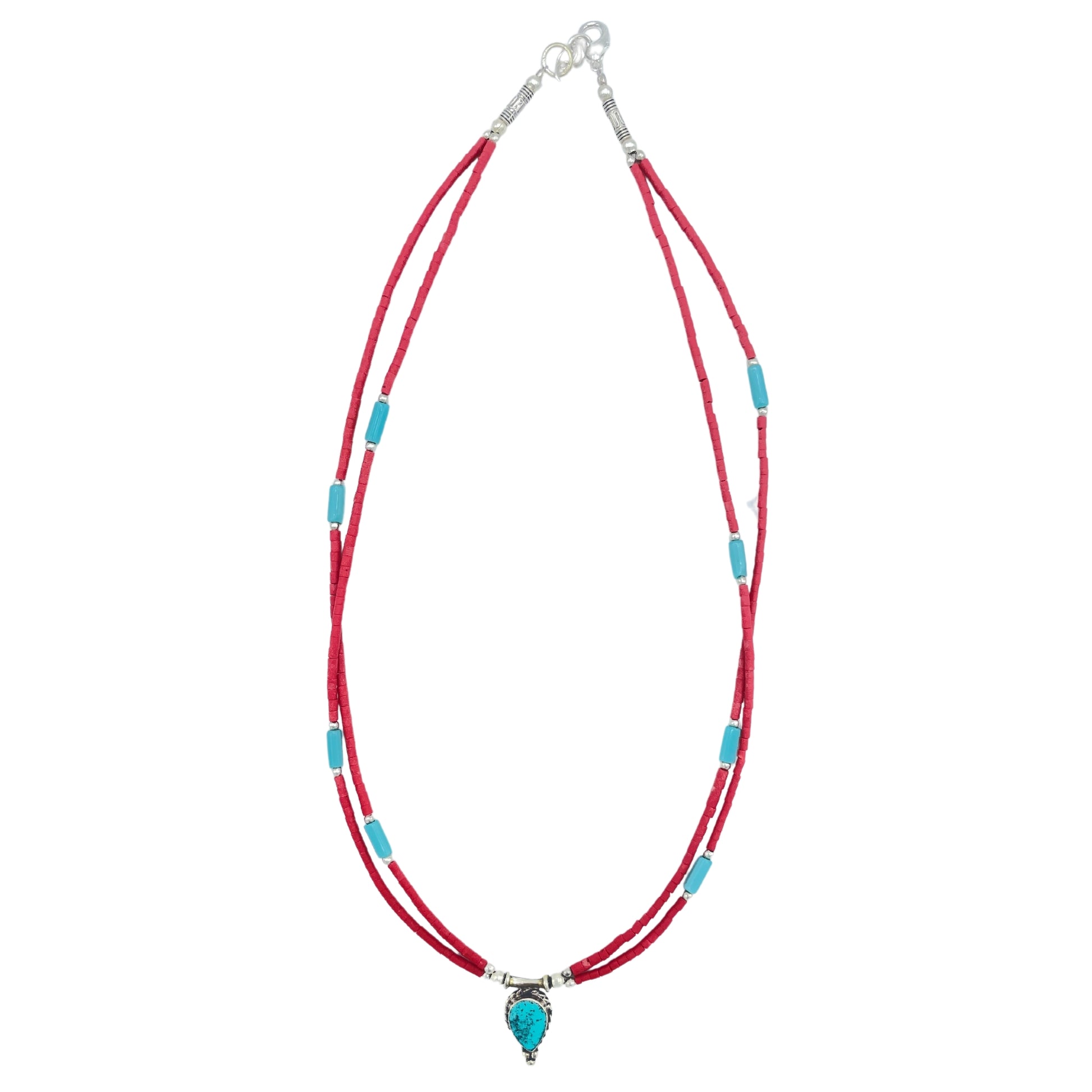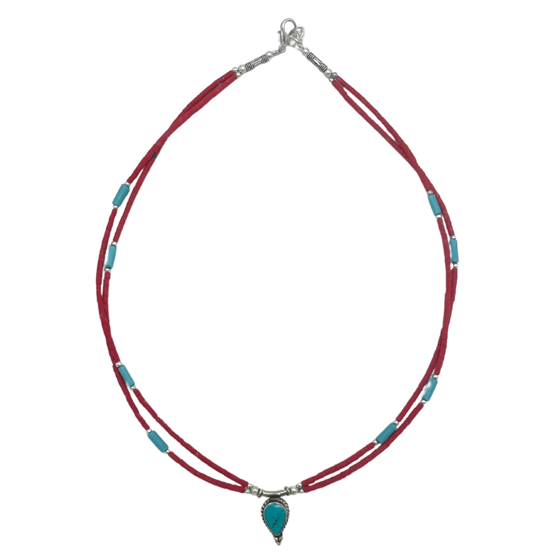 Extra dünne zweireihige nepalesische Halskette – rosa und türkisfarbener Anhänger