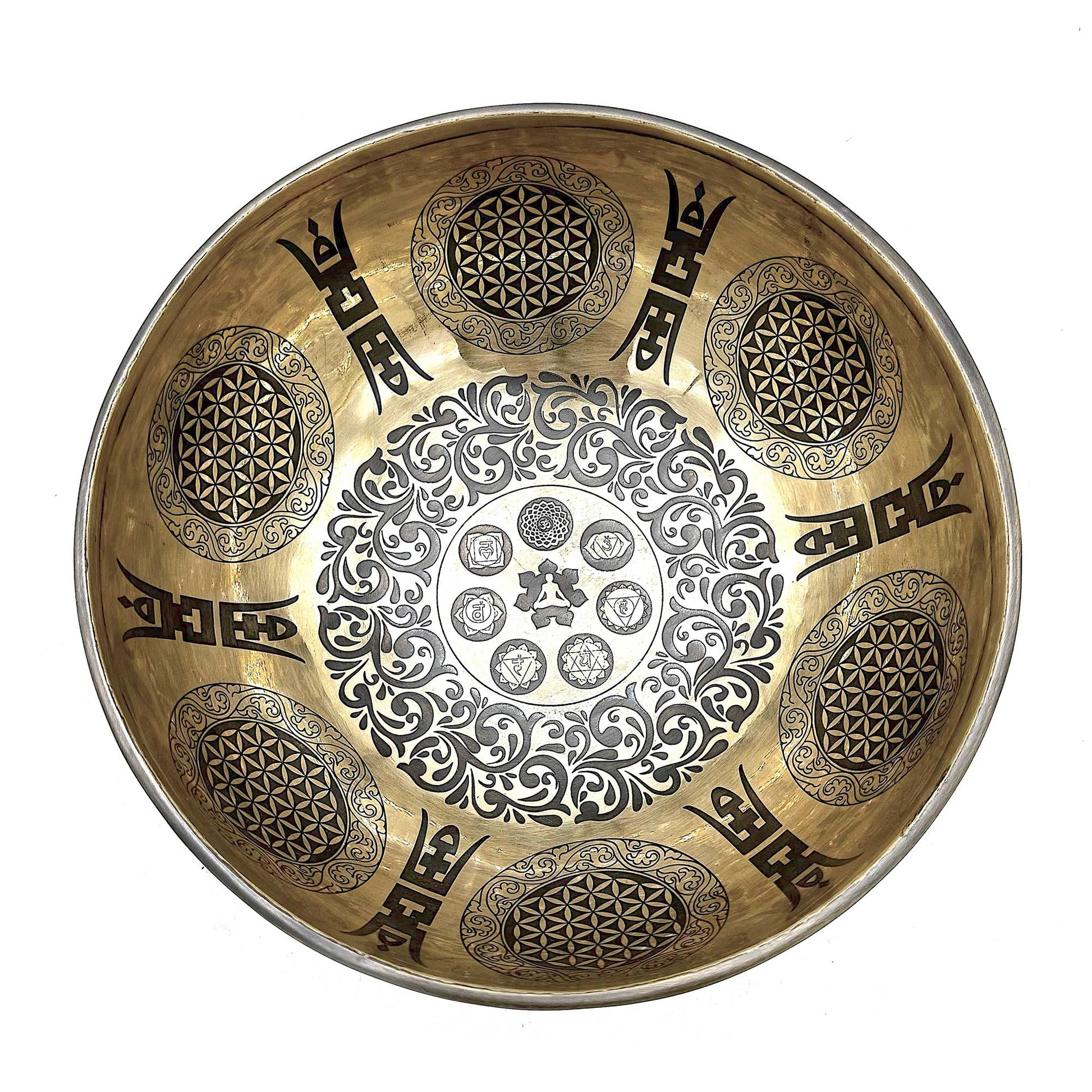 Gravierte heilende tibetische Klangschale – 21 cm – 7 Chakren und Blume des Lebens