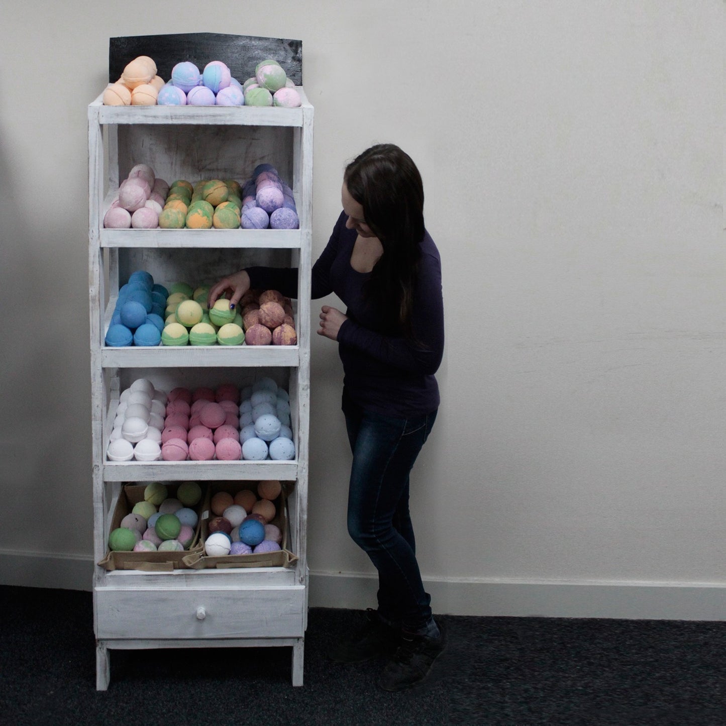 Entdecken Sie die eleganteste Art, Ihre Dekorationsartikel hervorzuheben, mit dem Bath Bomb 5 Shelf Display – Weiß . Dieses Regal ist ein echter Blickfang und nicht nur ein praktisches Accessoire, sondern auch eine ideale ästhetische Ergänzung für jeden Raum.
