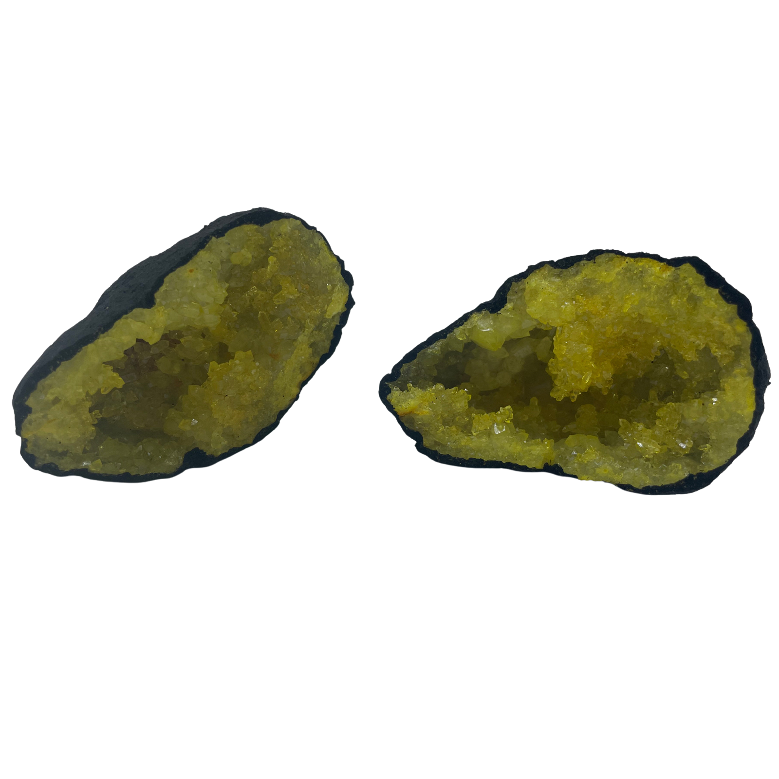 Lassen Sie die Natur mit den farbigen Calcit-Geoden – Schwarzer Stein – Gelb – im Herzen Ihres Zuhauses ihre prächtige Schönheit entfalten. Diese einzigartigen, umweltfreundlichen Stücke verleihen jedem Raum einen Hauch von Farbe und lebendiger Energie. Calcit, bekannt für seine reinigende und revitalisierende Wirkung, präsentiert sich hier in einer atemberaubenden Palette intensiven Gelbs, das einen perfekten Kontrast zur Robustheit des schwarzen Steins bildet.