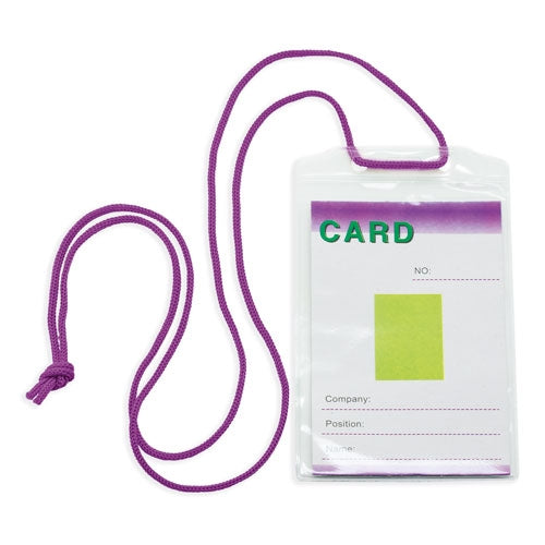 - Identificador transparente con cordón lila de 110 cm de longitud