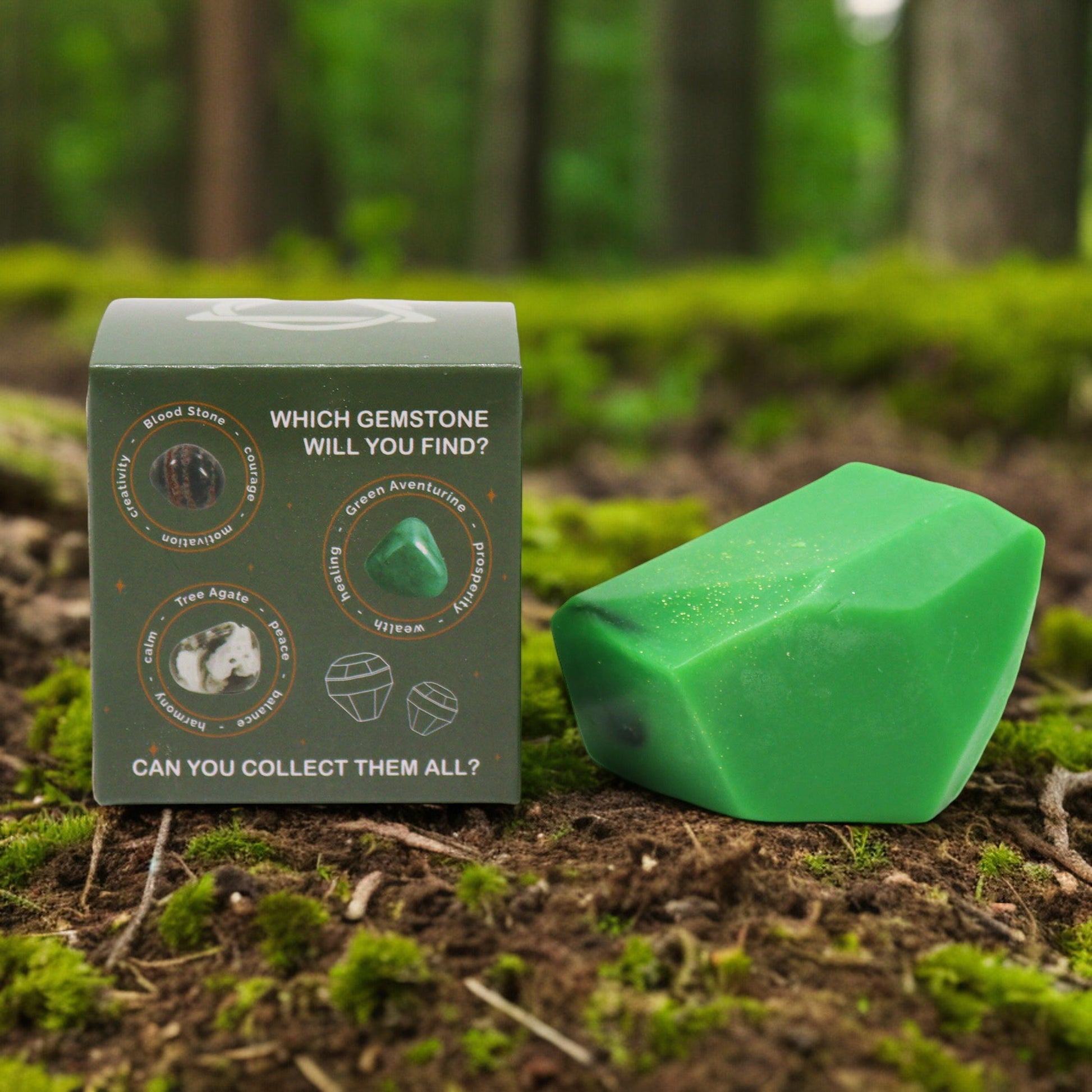 Diese Seife wird Ihre Kunden mit einer Auswahl an Kristallen begeistern, darunter Blutstein zur Stärkung der Energie, grüner Aventurin, um Wohlstand und Überfluss anzuziehen, und Baumachat, um die Verbindung mit der Natur zu fördern.