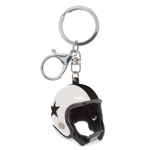 Ein origineller Schlüsselanhänger in Helmform im Vintage-Stil. Neben dem Schlüsselring enthält er auch einen Karabinerhaken. Präsentiert in einem weißen Kartonblatt in einem transparenten OPP-Beutel. Mit selbstklebendem Verschluss. Erhältlich in fünf verschiedenen Farben: Orange, Weiß, Schwarz, Rot und Blau.