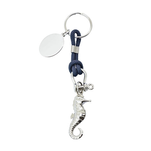 Silberner Seepferdchen-Schlüsselanhänger, inklusive blauer Kordel und Anhänger zur Laserbeschriftung. Jedes Stück ist einzeln versiegelt (offen geliefert zur einfachen Handhabung).