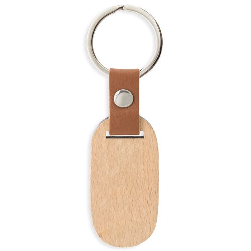 Schlüsselanhänger aus Holz mit PU-Details und Metallic-Finish. Präsentiert in Karton und einer individuellen Tasche.