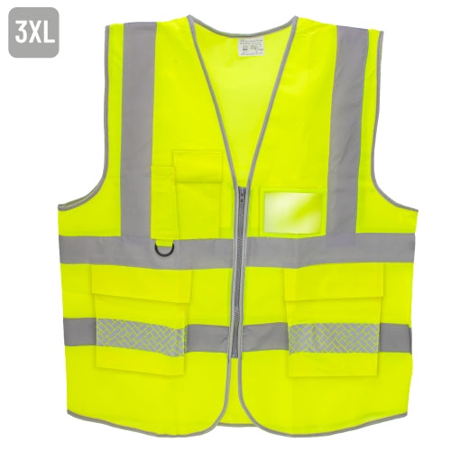 Warnweste mit zwei Seitentaschen (16 x 18,5 cm), einem Ausweisfach (10,5 x 7,2 cm) und einer Klettverschlusstasche (6,5 x 15 cm). Jedes Teil in einer separaten Tasche. Größentabelle: L: 60 x 70 cm (Breite x Länge). 3XL: 68 x 74 cm (Breite x Länge).