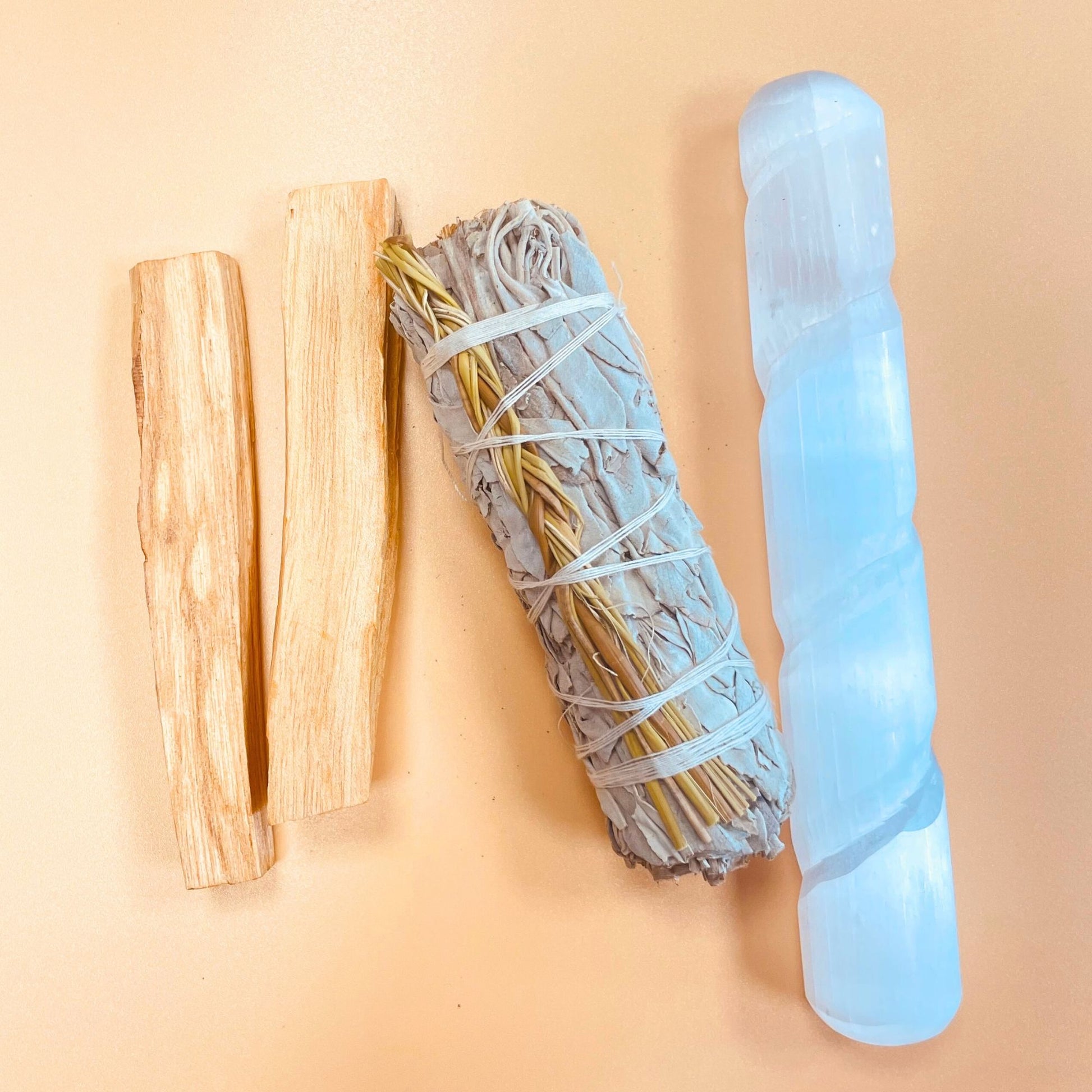 Beim Öffnen des Reinigungspakets finden Sie eine Auswahl ätherischer Elemente, jedes ausgewählt aufgrund seiner reinigenden Eigenschaften. Es enthält weißen Salbei, bekannt für seine Fähigkeit, Umgebungen von negativen Energien zu befreien, sowie Palo Santo, geschätzt für sein wohltuendes Aroma und seine entspannende Wirkung. Dieses Paket enthält außerdem eine Auswahl an Halbedelsteinen, die speziell für ihre ausgleichenden und schützenden Eigenschaften ausgewählt wurden.