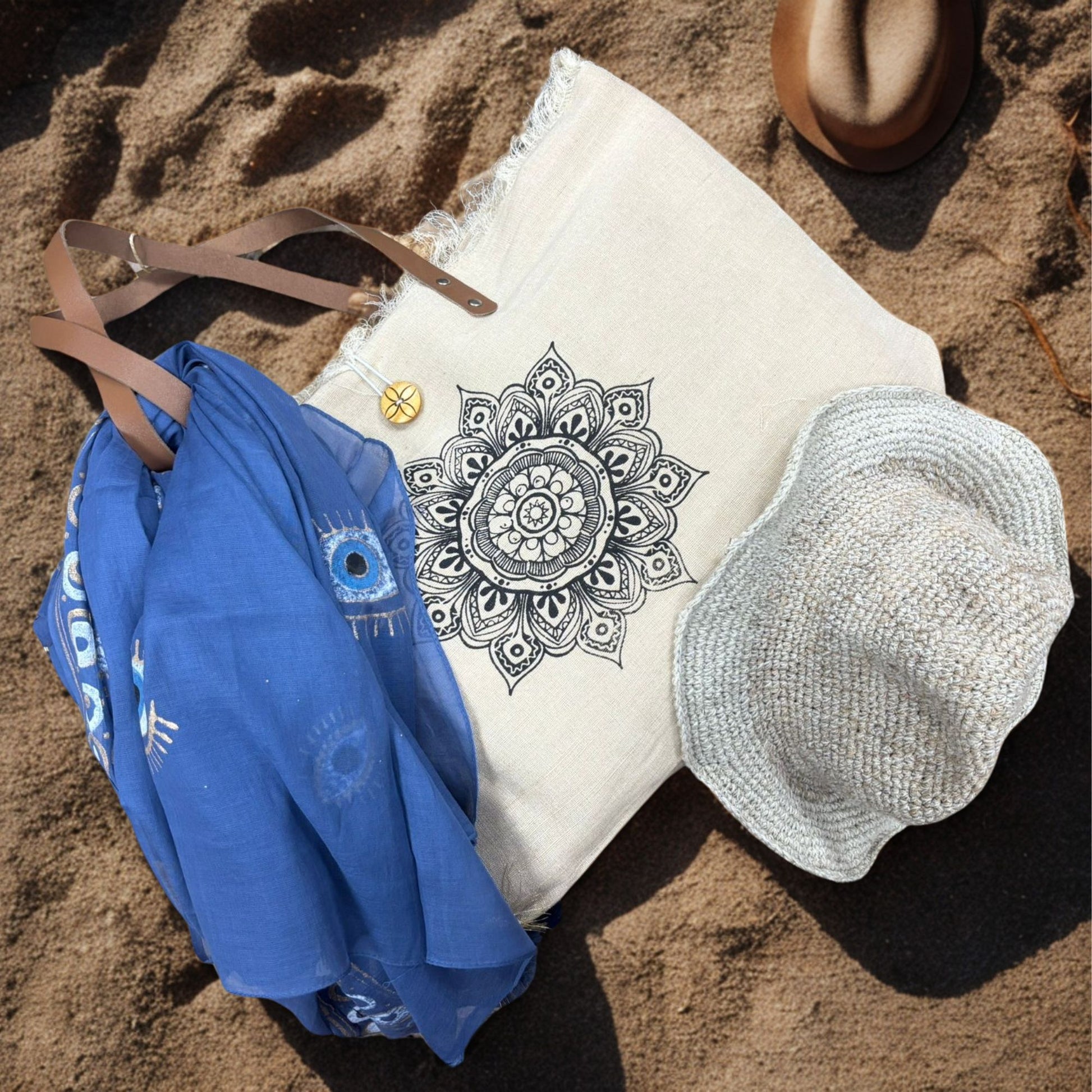 - • Handgewebter Boho-Hut aus Hanf und Baumwolle, leicht und atmungsaktiv
