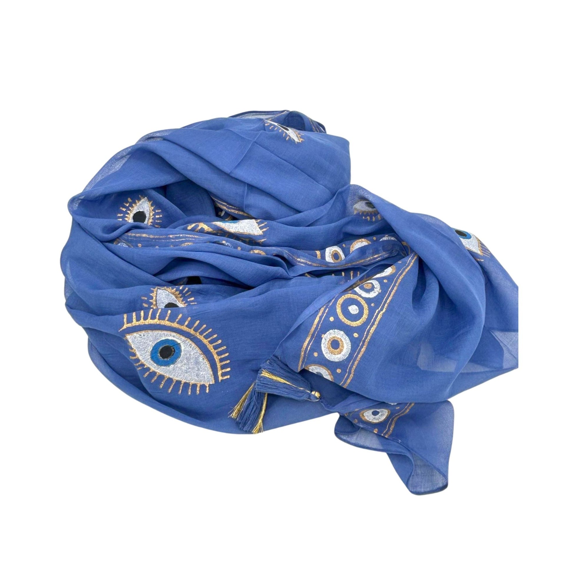 - • Pareo im Evil Eye-Design in sattem Blau und Gold, perfekt für den Strand oder einen lässigen Look