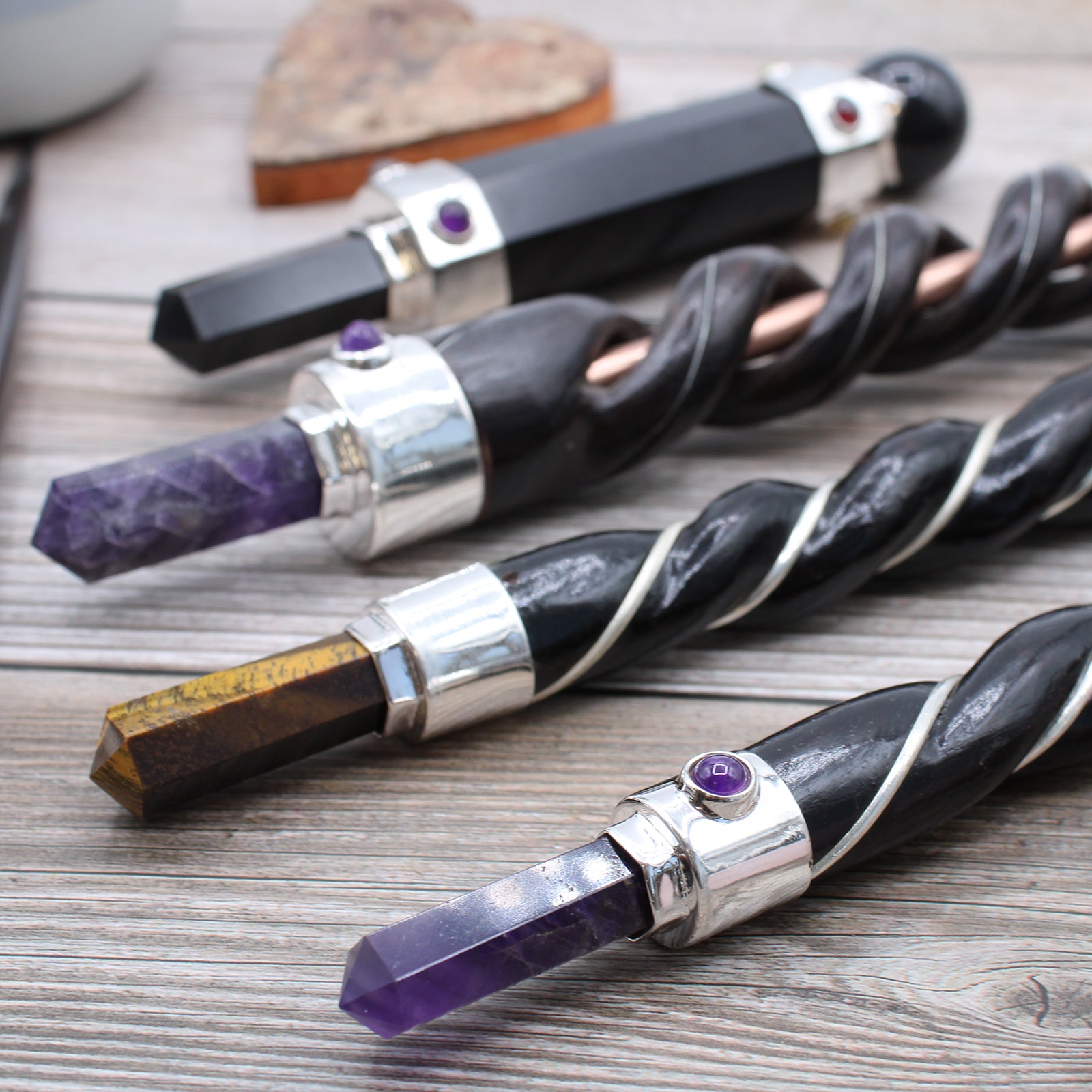 Die sorgfältige Handwerkskunst ist in jeder Kurve und Facette des Zauberstabs erkennbar und lädt dazu ein, ihn in Ihre Einrichtung zu integrieren. Stellen Sie sich dieses prächtige Stück in Ihrem Bücherregal, auf Ihrem Schreibtisch oder als Mittelpunkt vor, das Aufmerksamkeit erregt und als Gesprächsthema über seine Schönheit und spirituelle Bedeutung dient. Es ist nicht nur ein dekoratives Element, sondern ein Stück, das diejenigen anspricht, die Harmonie und Wohlbefinden in ihrer Umgebung schätzen.