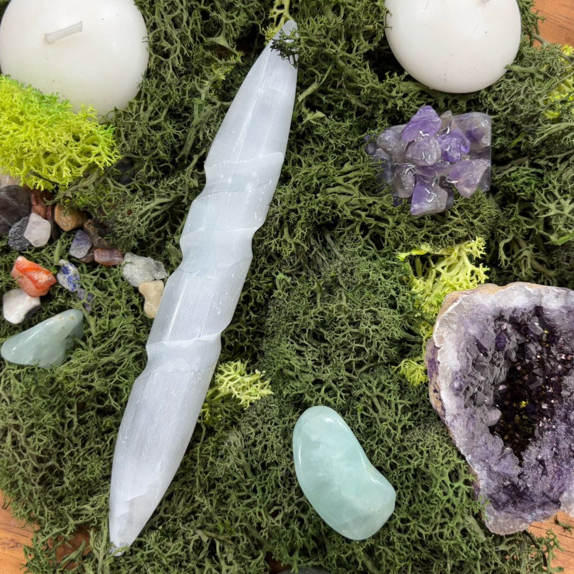 - 16 cm langer Selenit-Spiralstab mit spitzen Enden