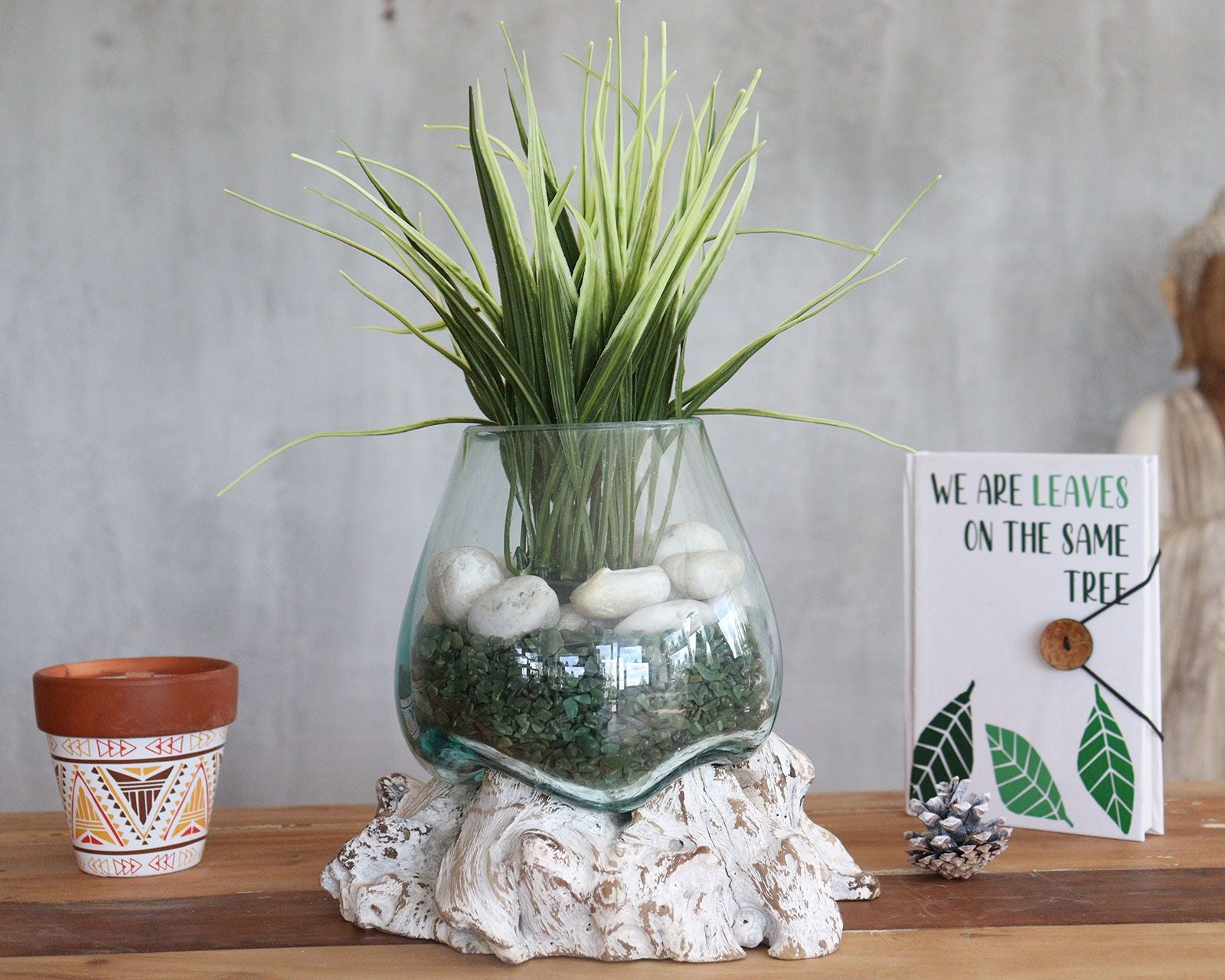 Gebleichtes Holz, ausgewählt aufgrund seiner Qualität und natürlichen Schönheit, dient als Basis für eine zarte, geschmolzene Glasschale, die darüber zu schweben scheint. Diese Kombination ist nicht nur ästhetisch ansprechend, sondern symbolisiert auch die Verbindung von Natur und menschlicher Arbeit. Ideal für die Dekoration Ihres Wohnzimmers, Esszimmers oder sogar Ihres Büros, passt das moderne Design zu jedem Einrichtungsstil.