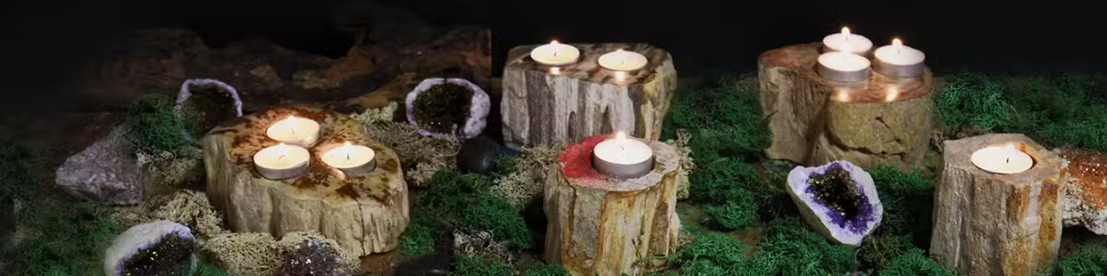 Ce sont des bougeoirs en pierre naturelle, dont la couleur évoque le bois, leur donnant le nom de bois pétrifié.