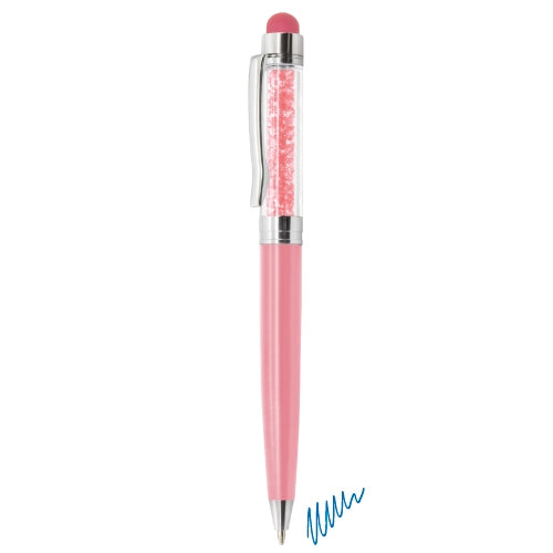 Stylo à bille original et élégant, doté d'un système rotatif et décoré de strass à l'intérieur. Toucher tactile pour une utilisation sur téléphone portable ou tablette. Écriture bleue. Chaque exemplaire est présenté dans un sachet individuel.