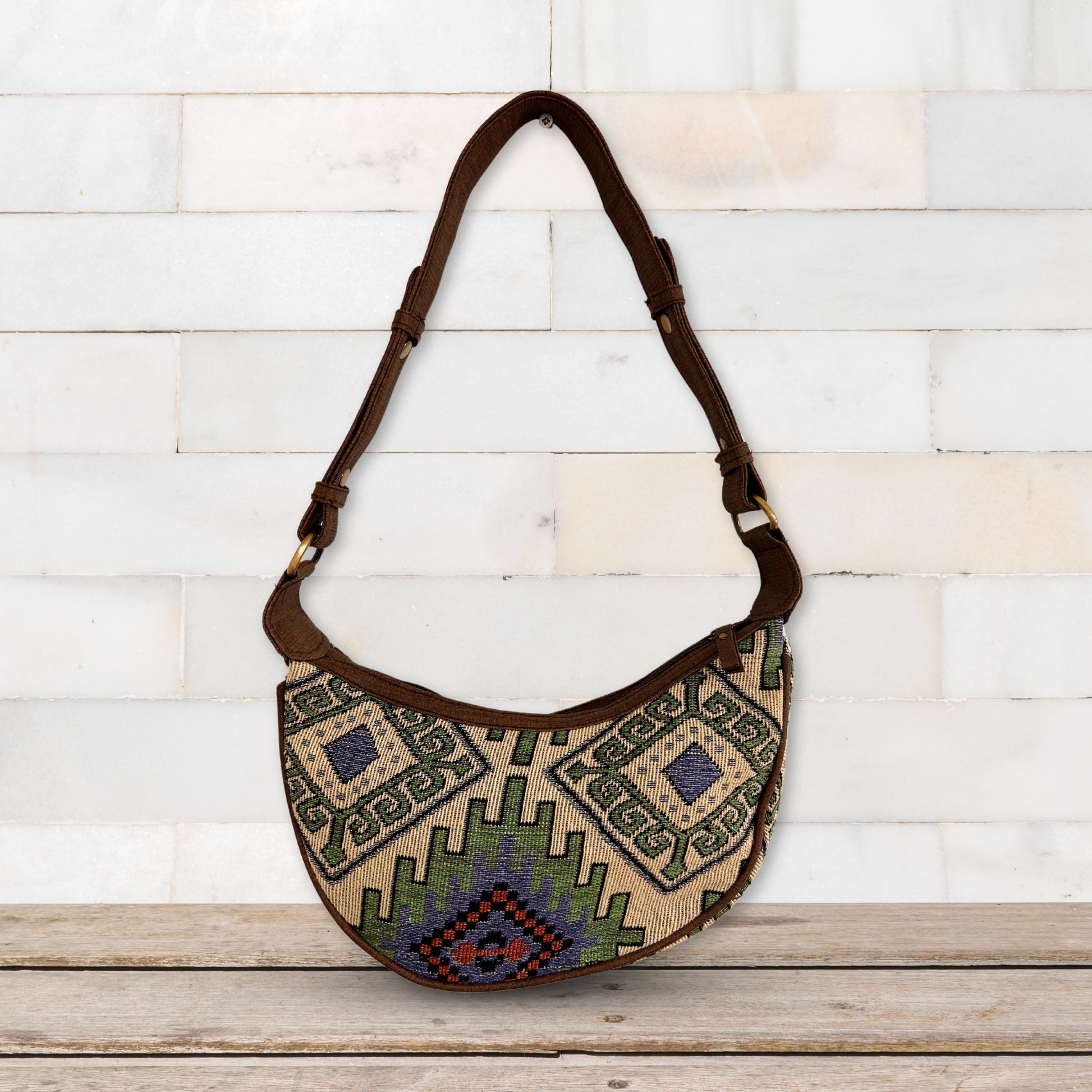 Sac hobo Jacquard - Géo-Vert (Bandoulière Marron)