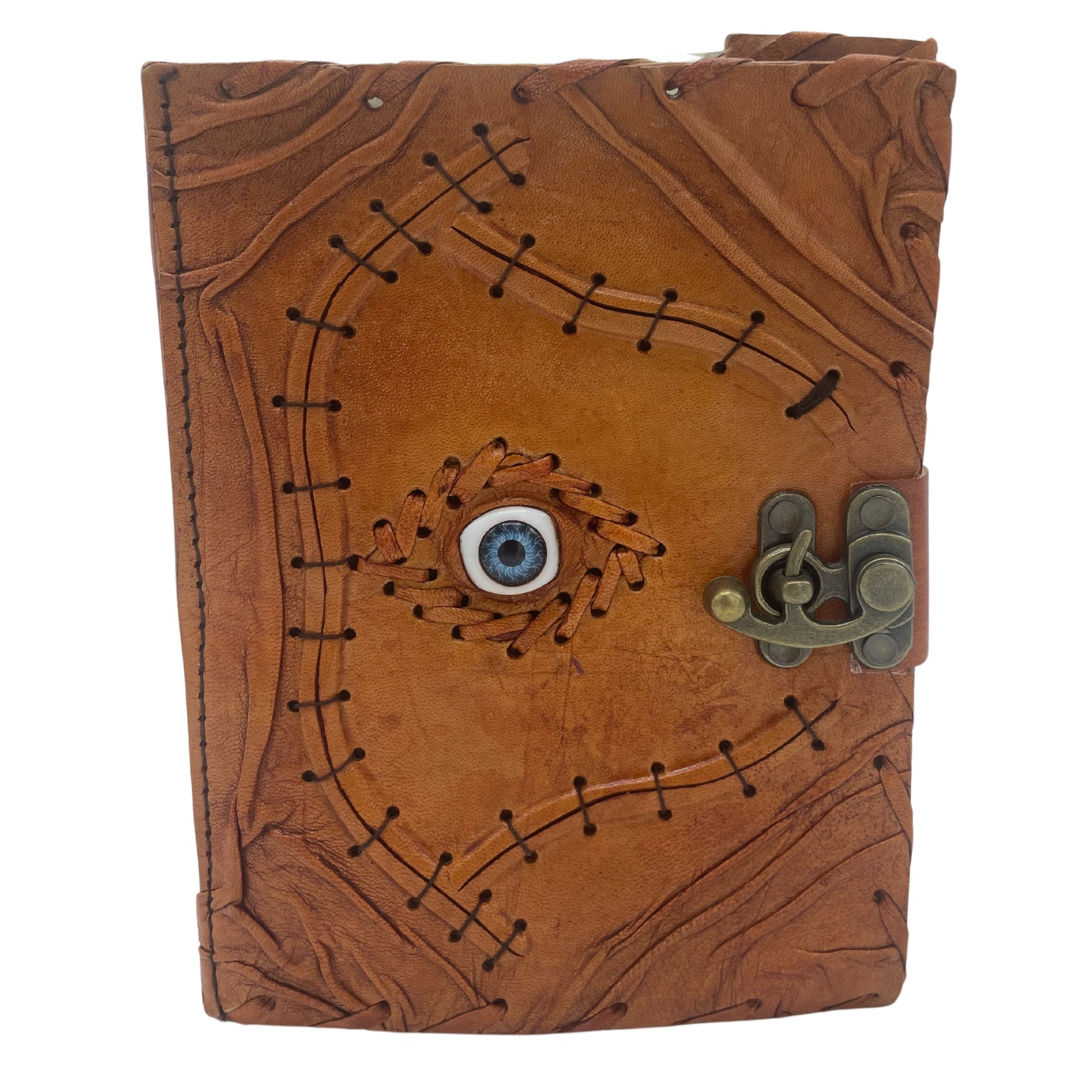 Carnet de notes marron clair avec bords usés et motif mauvais œil