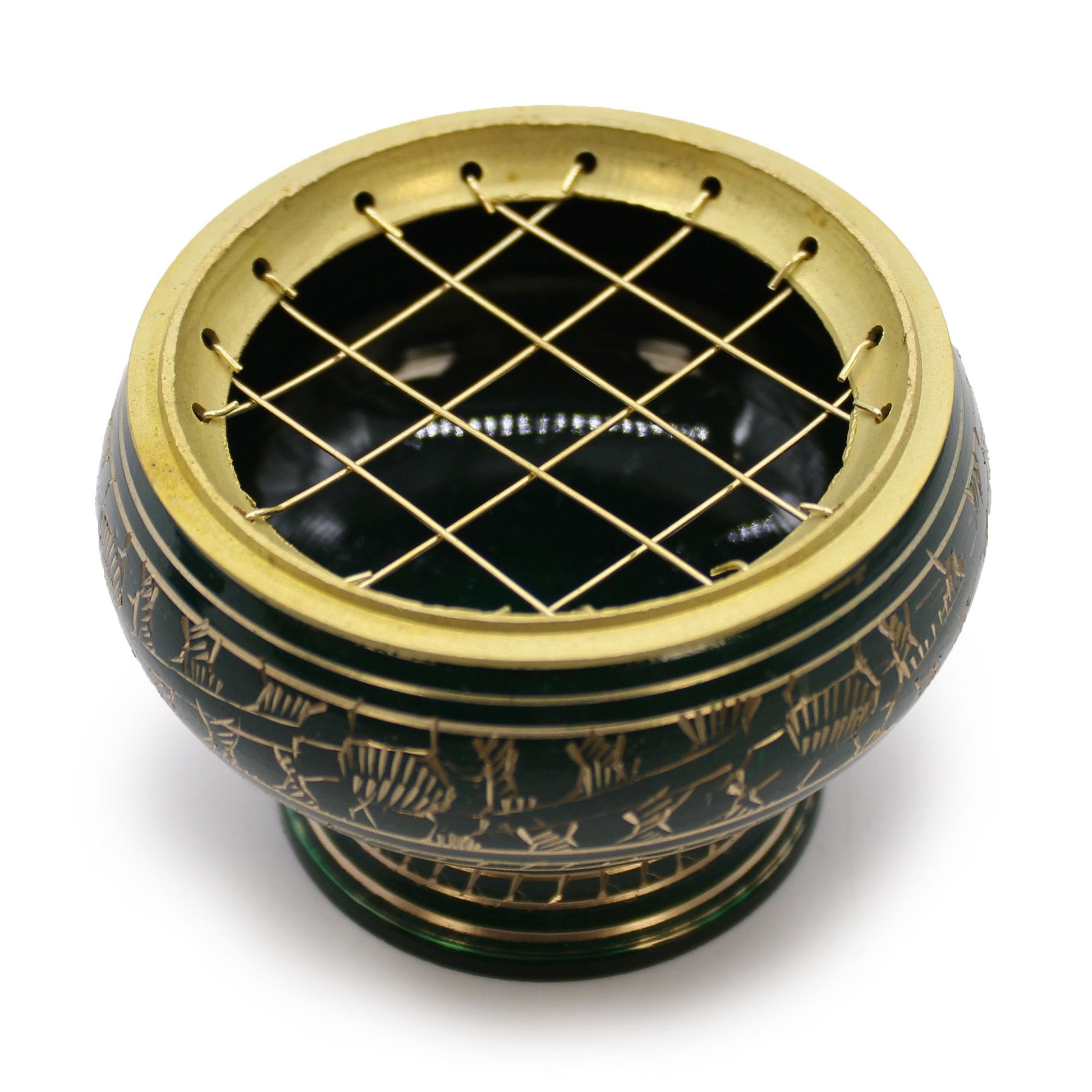 Ce grand bol à encens, orné d'une harmonieuse couleur verte et de délicats détails dorés, s'inspire du chakra du cœur, centre de l'amour, de la compassion et de la guérison émotionnelle. Fabriqué à la main en Inde à partir de laiton de première qualité, il allie savoir-faire traditionnel et symbolisme spirituel pour créer une pièce unique qui sublimera n'importe quel espace.