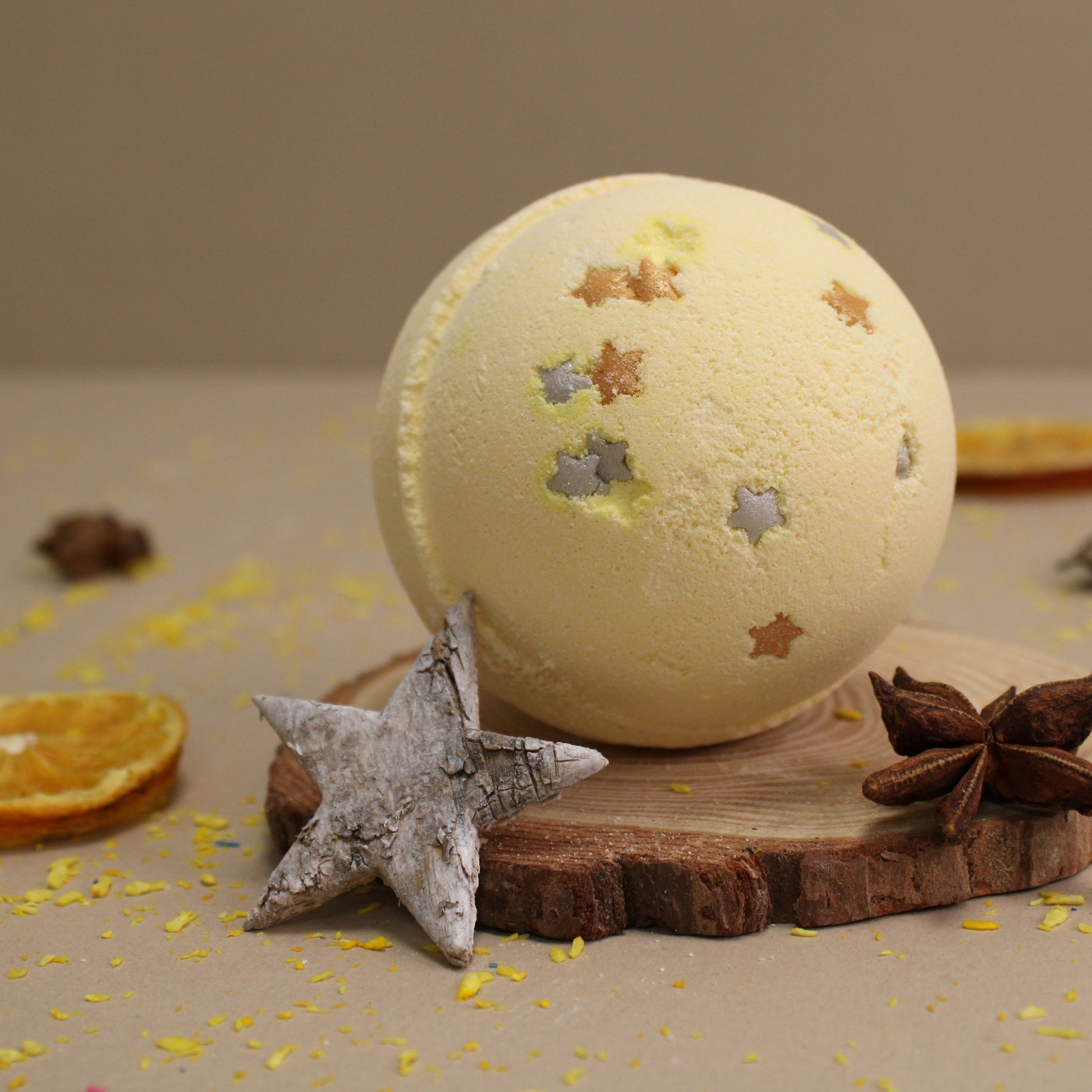 - Bombe de bain (7,5 cm de diamètre) étoile de Noël à l'arôme de pâte d'amande, qui se dissout lentement dans l'eau, remplissant le bain d'un parfum festif et relaxant.