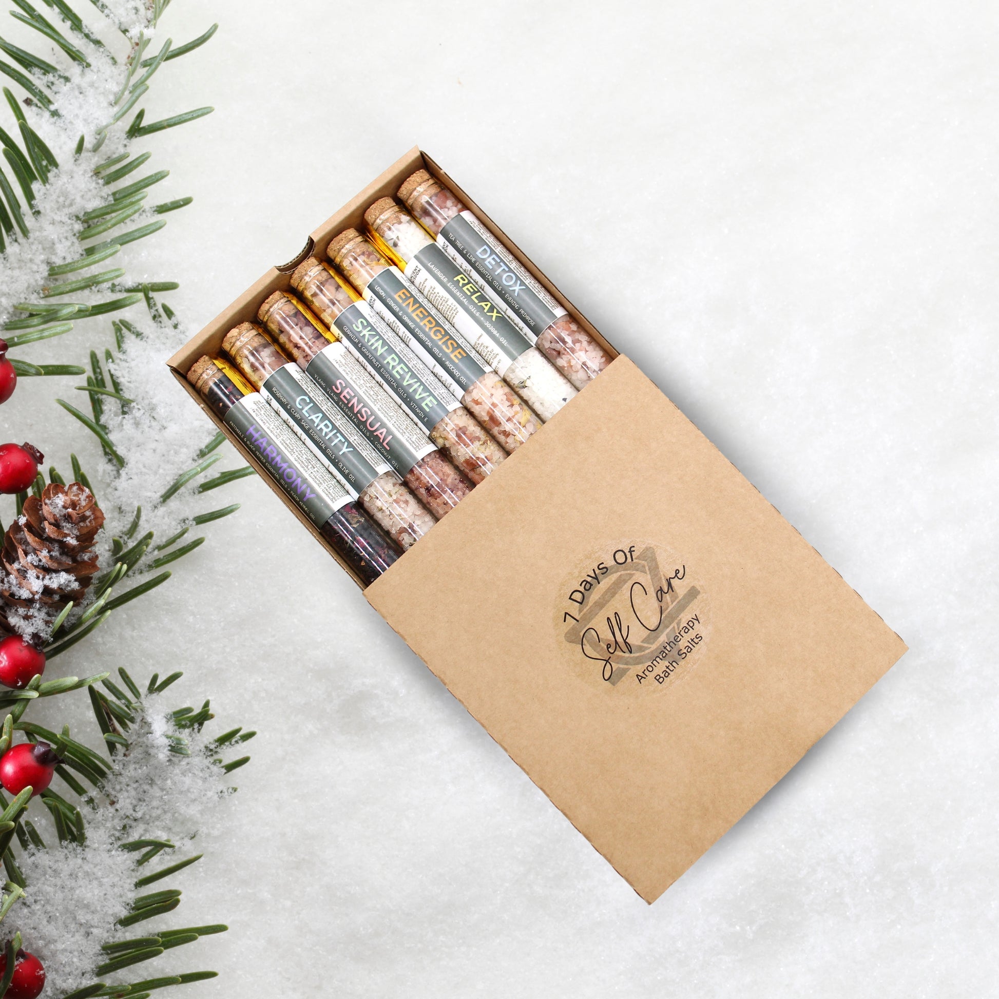 - Pack de 7 tubes de sels de bain, chacun conçu pour un jour de la semaine spécifique. Ces tubes contiennent des sels aromatiques aux propriétés relaxantes et rajeunissantes, parfaits pour créer un rituel de soins quotidien.