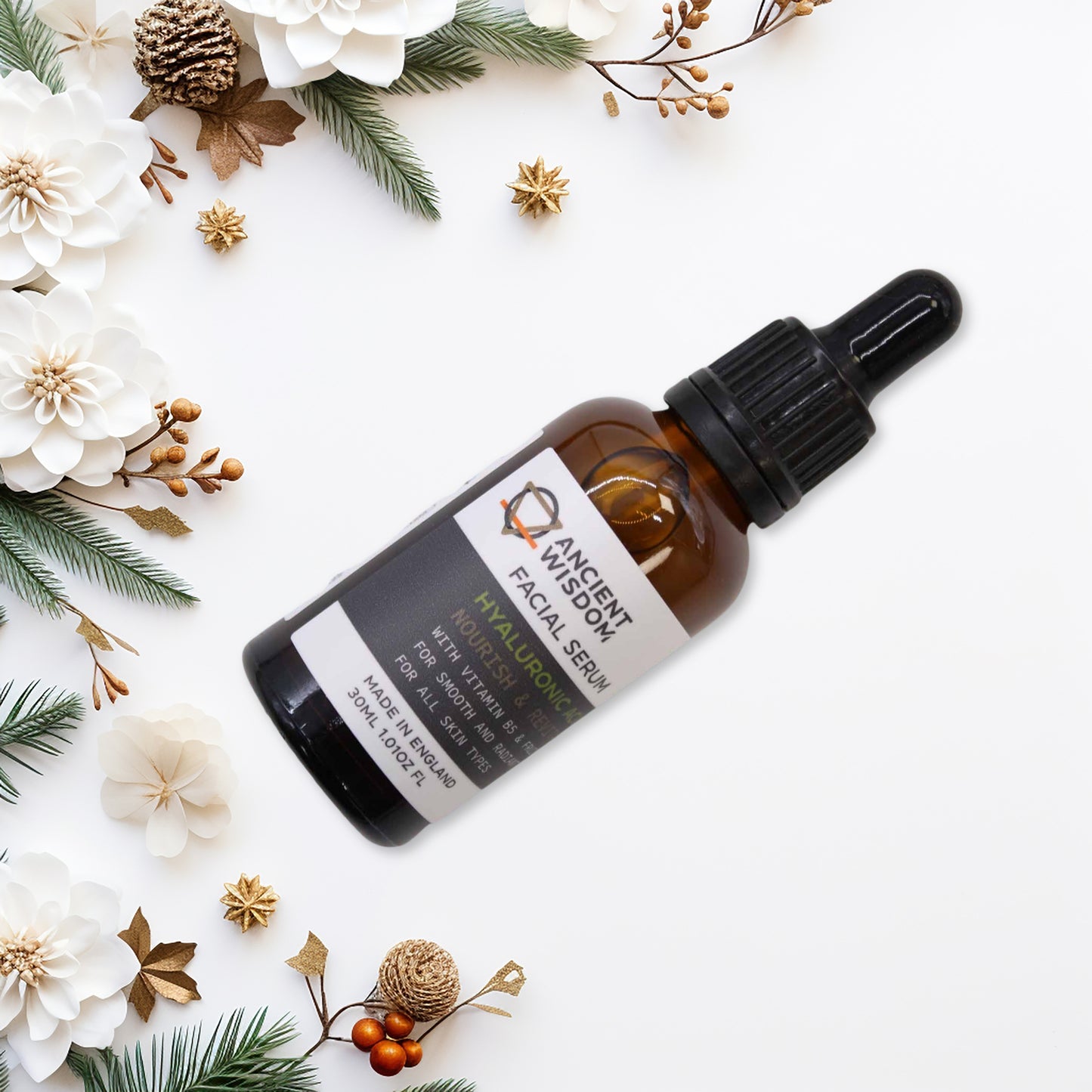 - Sérum visage à l'acide hyaluronique (30 ml) : Fabriqué au Royaume-Uni avec un bouchon compte-gouttes pratique, ce sérum hydrate en profondeur, aidant à combattre les signes du vieillissement.