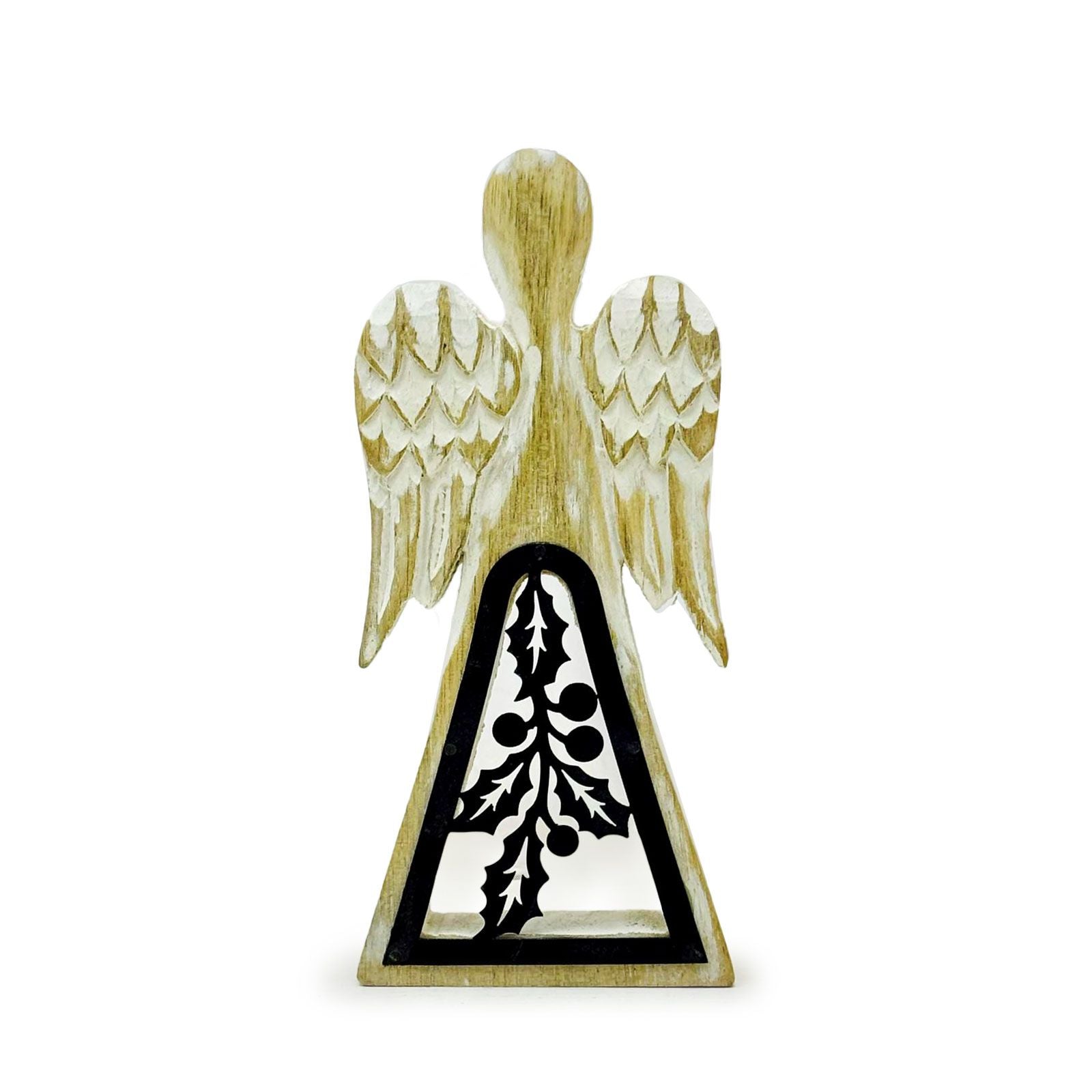 Ángel de madera de mango - Encalado con decoración de hierro recortado - 18 cm