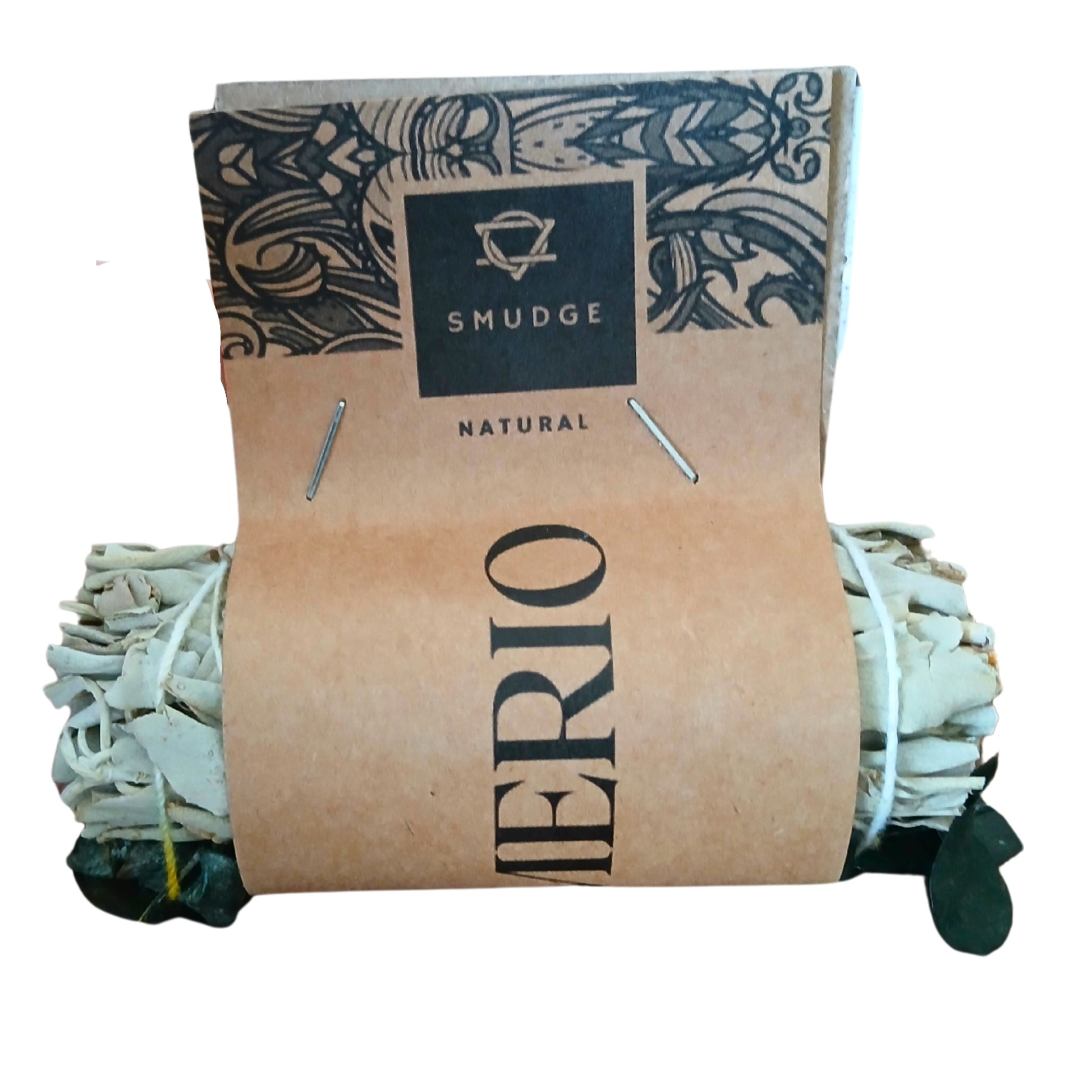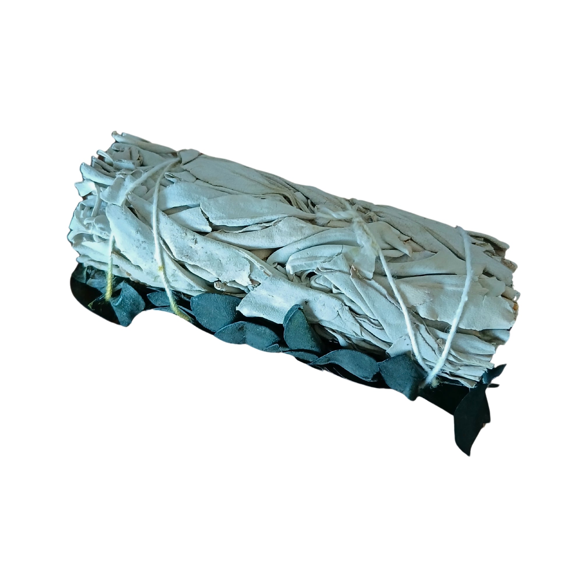 - Atado artesanal de hojas de salvia blanca y eucalipto