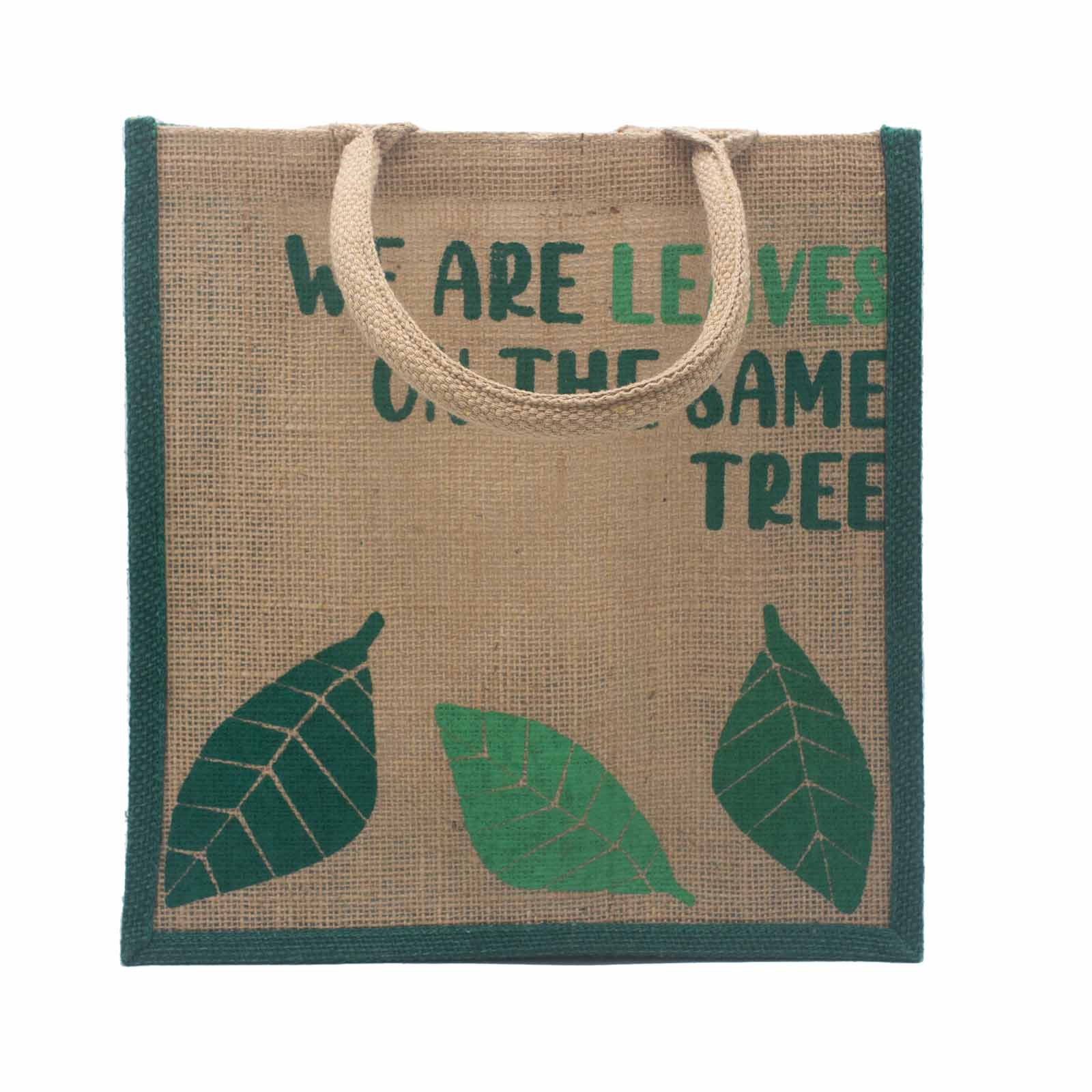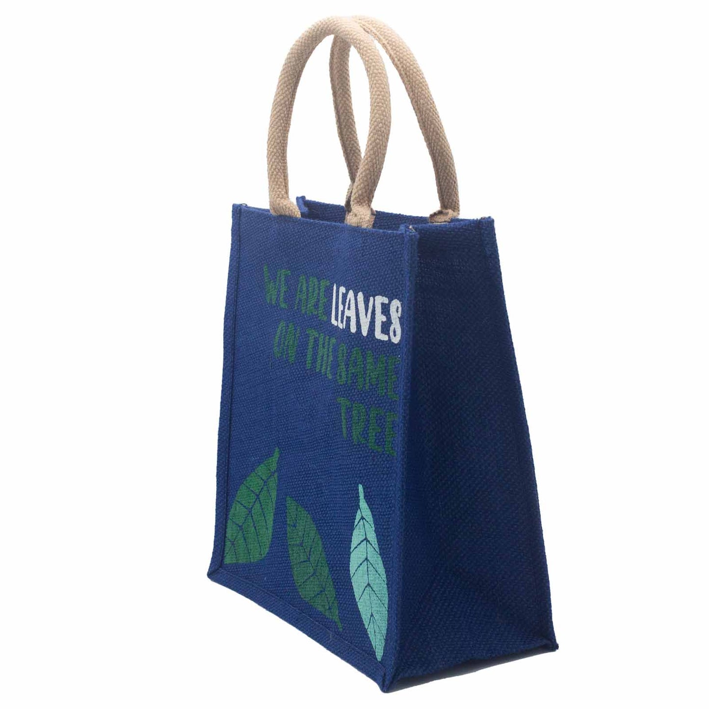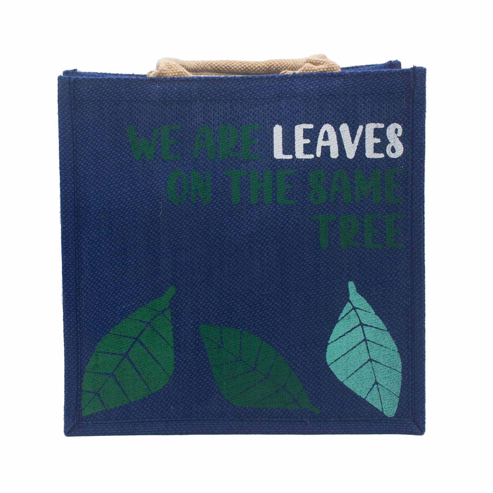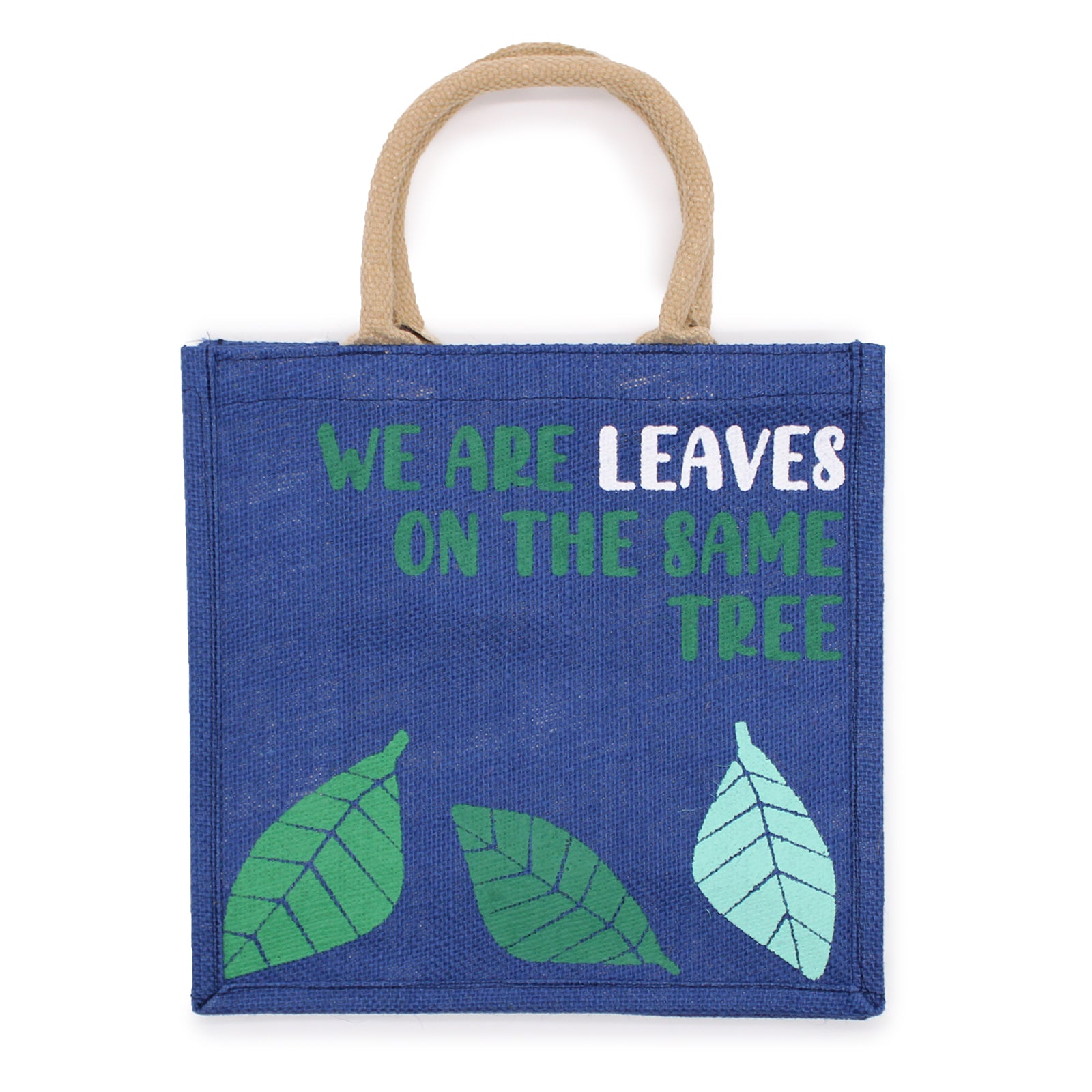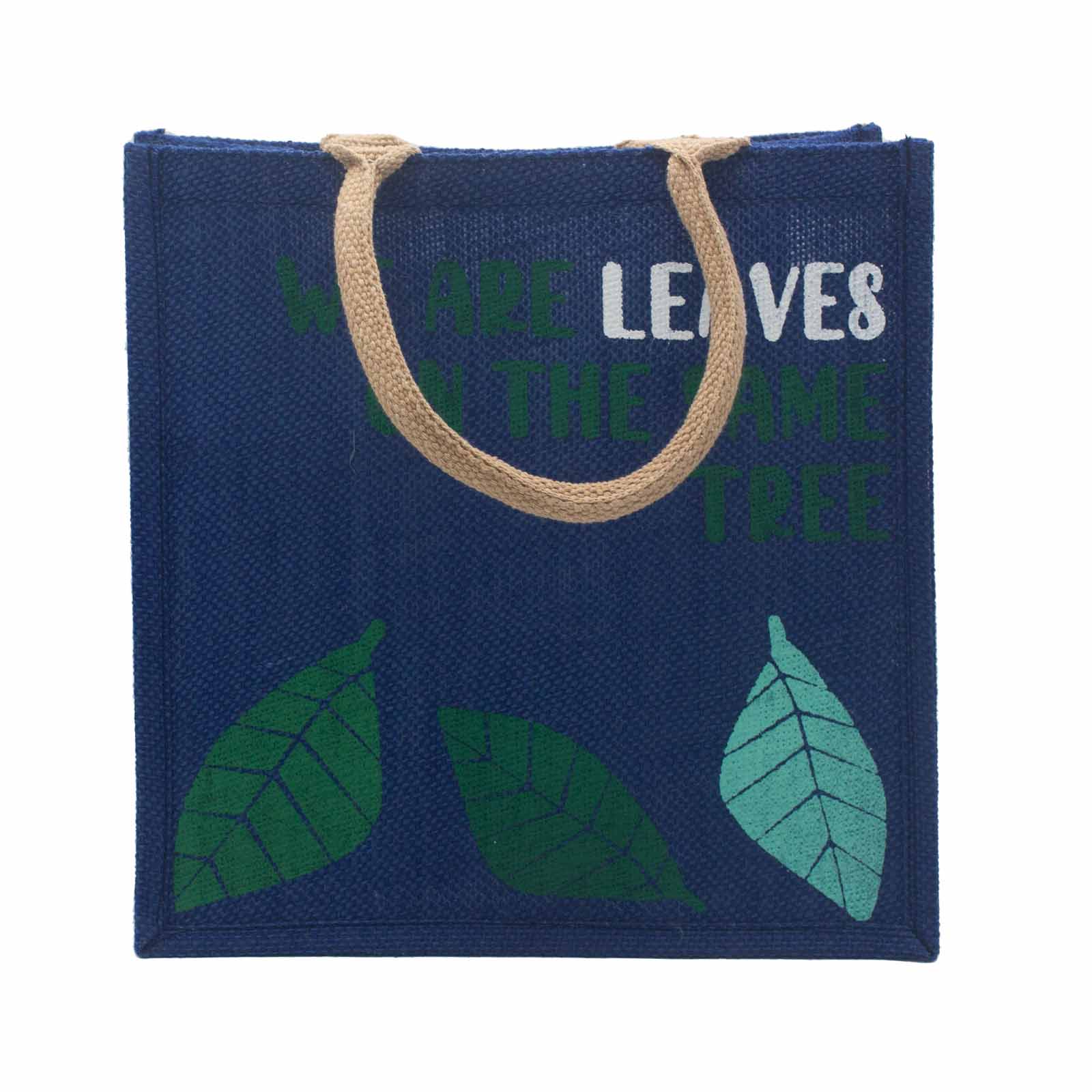 La bolsa de yute estampada - Somos hojas - Amarillo, Azul y Natural es un accesorio imprescindible para quienes aprecian la belleza de lo natural y la practicidad. Este diseño único intercala el arte y la naturaleza con un estampado vibrante que captura la esencia de la hojarasca en tonos amarillo, azul y natural, portando un mensaje de conexión con el medio ambiente.