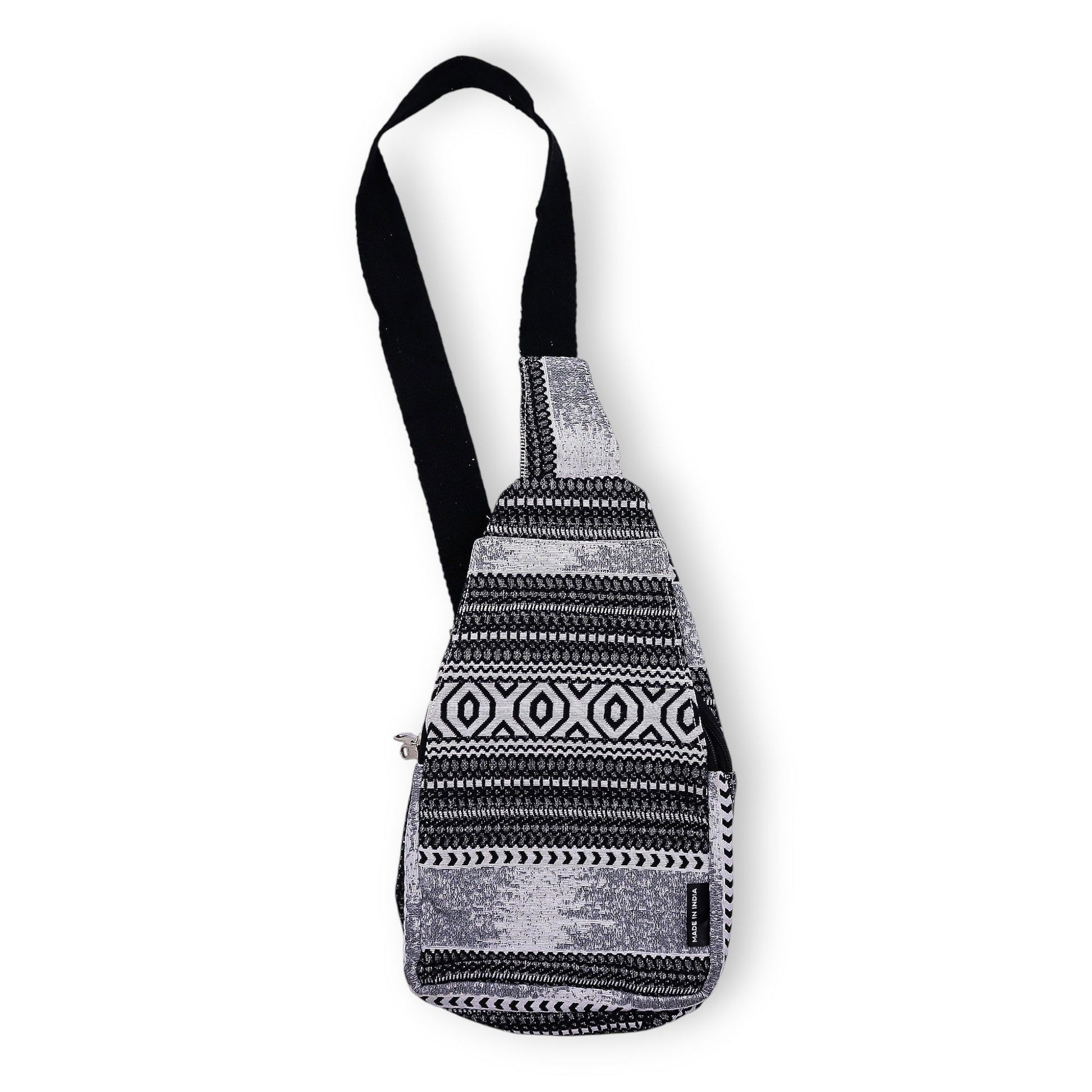 Fácil de llevar y lleno de carácter. Esta bolsa cruzada de jacquard hecha a mano presenta un patrón monocromo audaz y una forma práctica y ligera que se integra sin esfuerzo en la vida cotidiana.