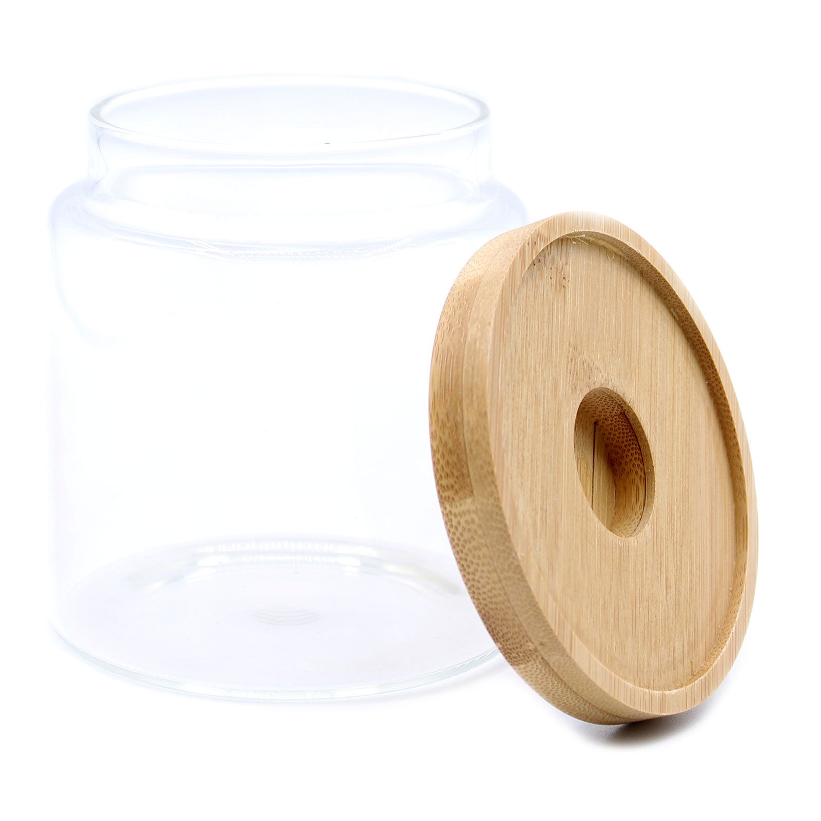 Este elegante tarro de cristal combina un diseño clásico con funcionalidad y sostenibilidad. Su tapa de bambú ecológica y el vidrio de borosilicato resistente al calor garantizan durabilidad y un estilo sofisticado que atraerá a tus clientes.