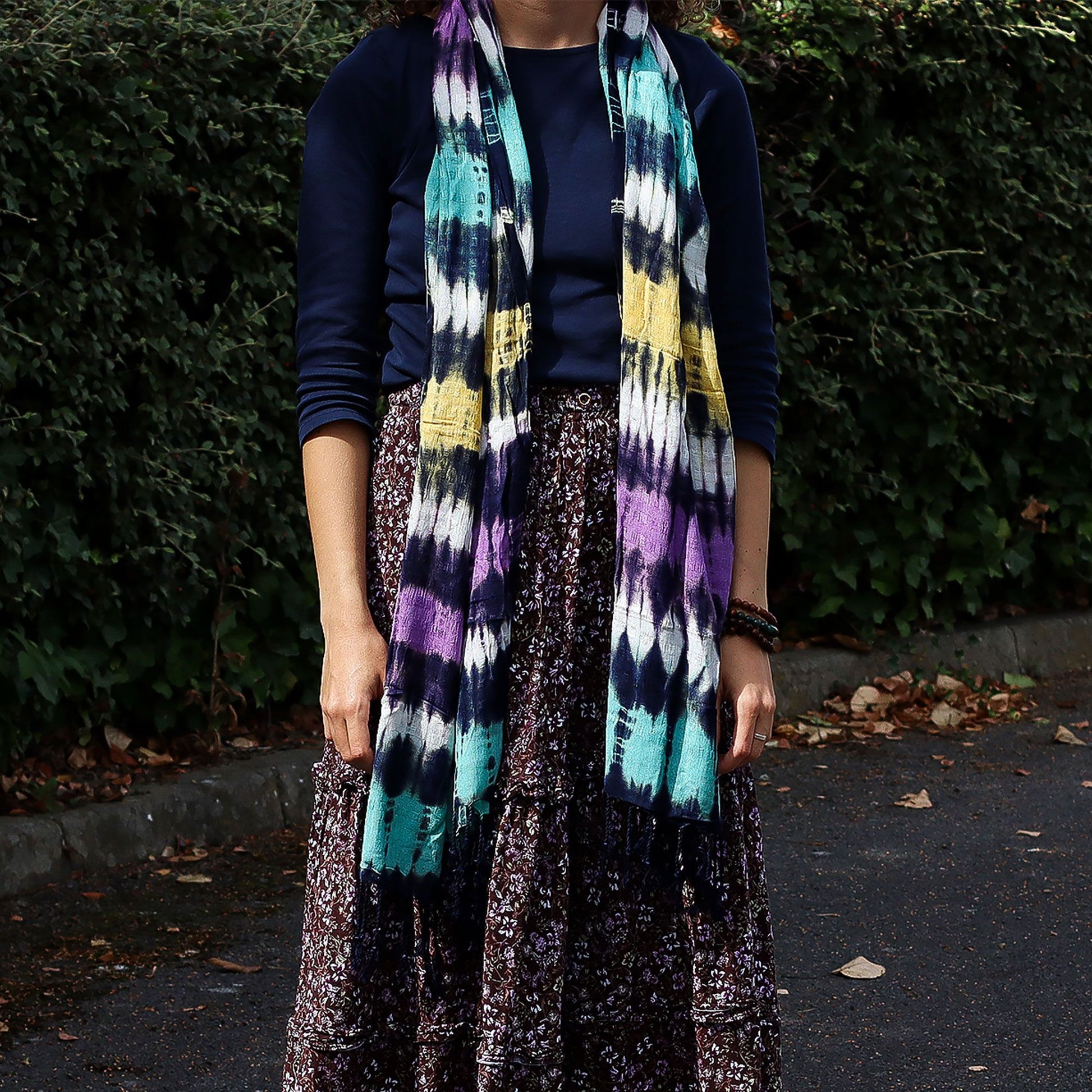 El diseño de rayas multicolor inspirado en el arte tradicional de Java aporta un look fresco y auténtico que realza cualquier outfit. Su tejido ligero y suave asegura confort durante todo el día, siendo ideal para complementar tanto looks casuales como más elaborados.