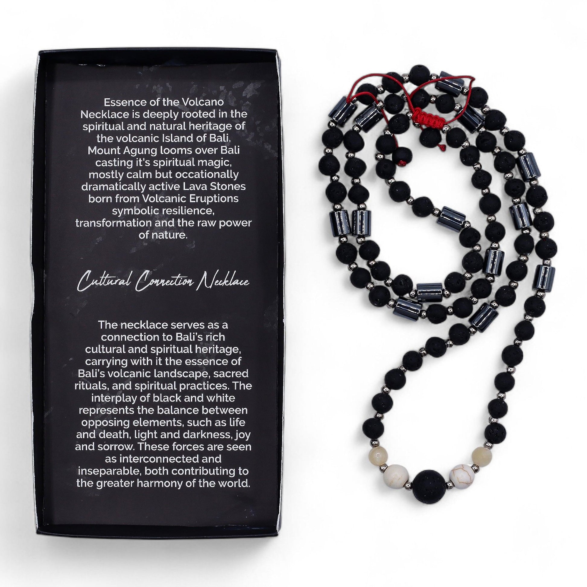 Lleva una parte del espíritu sagrado de Bali. Este collar combina piedras de lava negra y howlita blanca, que simbolizan la armonía entre la luz y la oscuridad, la vida y la muerte, la alegría y la tristeza - un reflejo del equilibrio en la naturaleza y dentro de nosotros mismos.<\/p>