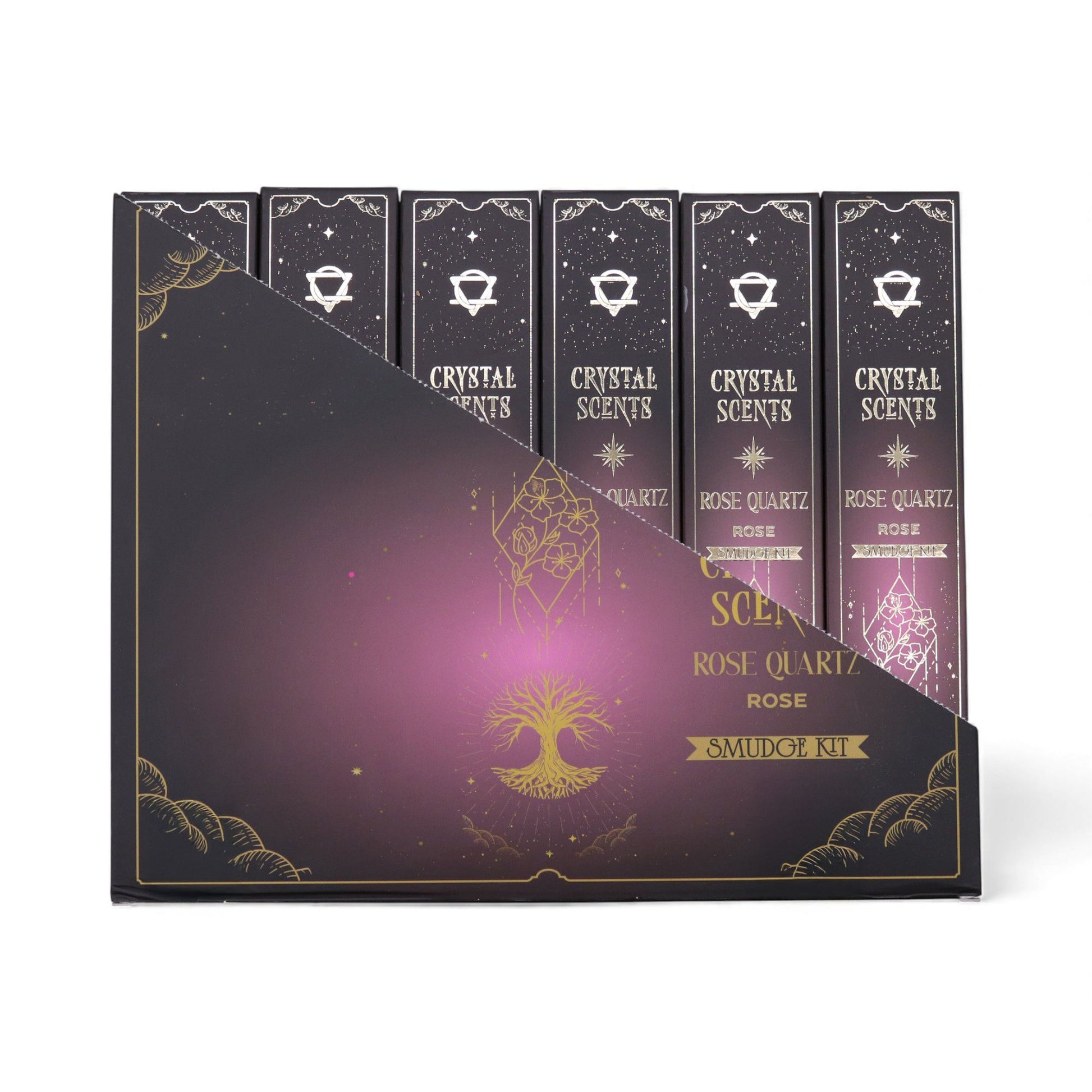 Cada paquete incluye una pequeña bolsa de trozos de cuarzo rosa, lo que lo convierte en una opción encantadora para cualquiera que disfrute de la energía de los cristales, rituales de autocuidado o regalos con significado. Las ramitas están envueltas en papel protector y presentadas en una funda de cartón de estilo celestial con un degradado suave en rosa.