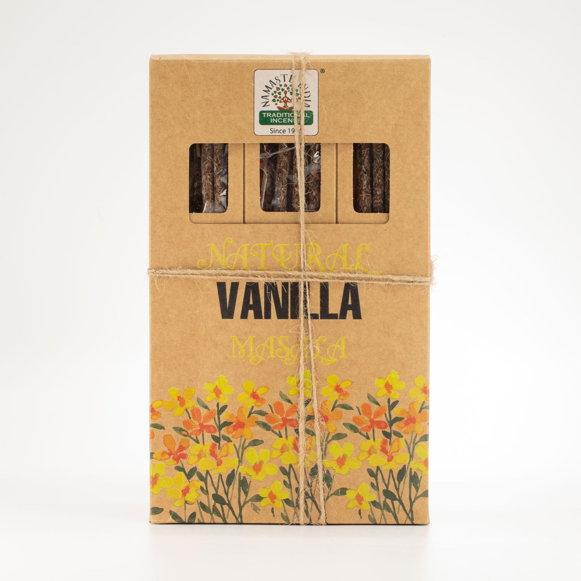 Este incienso de estilo masala botánico destaca por su acabado texturizado, que muestra la mezcla natural envuelta alrededor de cada varilla. La fragancia de vainilla es suave y familiar, lo que facilita disfrutarla en salas de estar, dormitorios o rincones de meditación, sin que resulte abrumadora. Presentado en una caja de estilo kraft natural con una ventana, también es un regalo considerado para cualquiera que disfrute de aromas ambientales en el hogar.