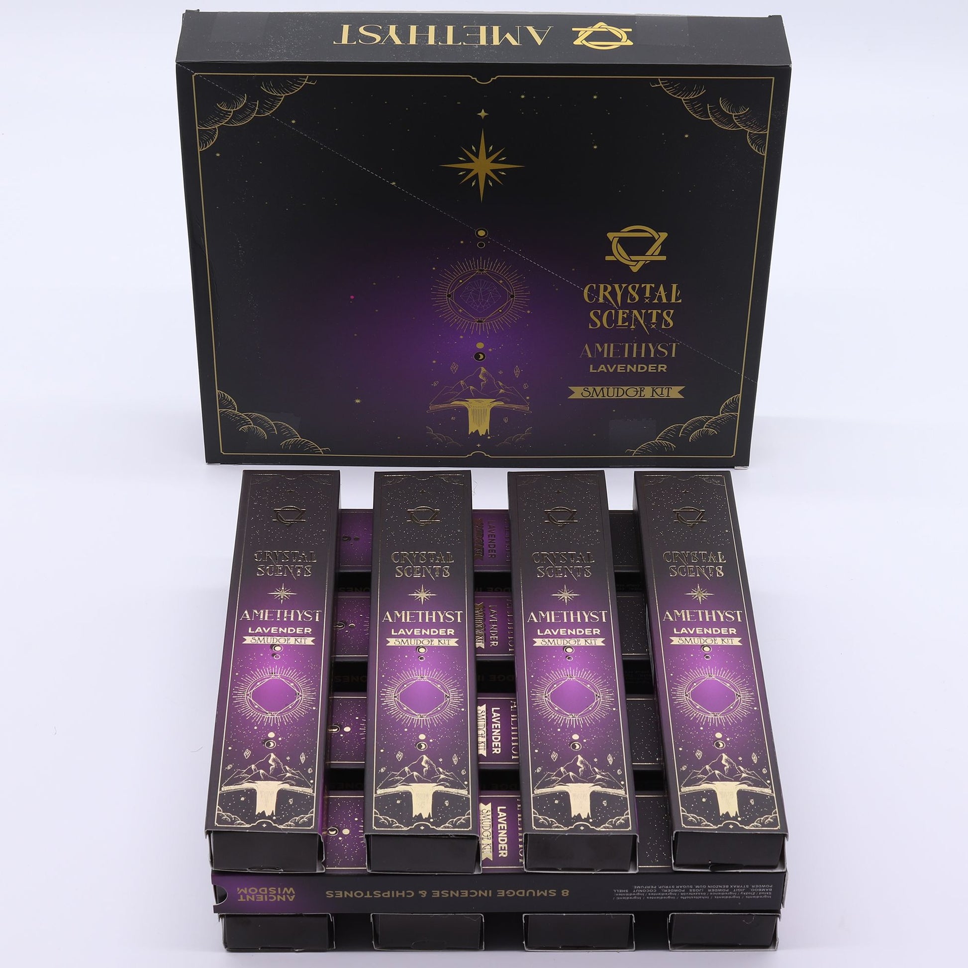 Cada paquete viene con una pequeña bolsa de trozos reales de amatista – un detalle pensado para cualquiera que disfrute de cristales o fragancias para el hogar con estilo ritual. Las varitas llegan envueltas en papel protector dentro de una funda de cartón con temática celestial, lo que las hace ideales como regalo o como un capricho personal para relajarte.