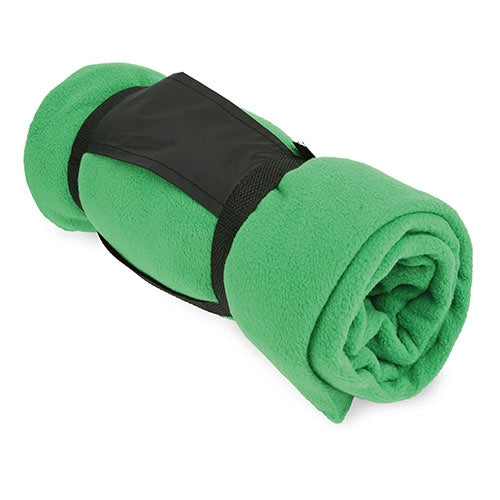 Manta polar, enrrollada y sujeta con asas de correa de poliéster, para guardar y tansportar. Estas mantas podrán ser usadas en el coche, en el campo o taparse en el sofáPresentación ideal para grabación
