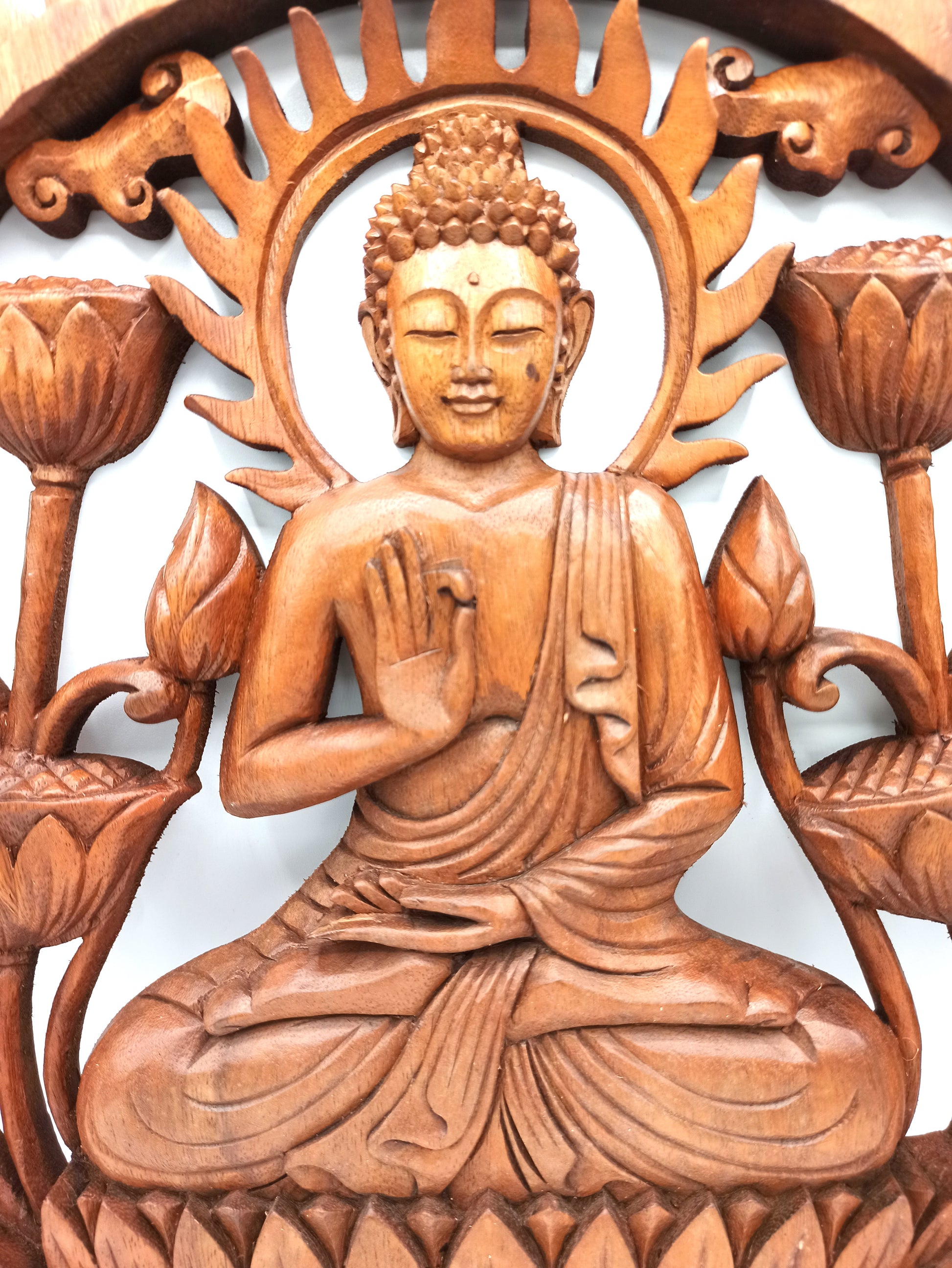 Fabricado con madera de alta calidad, este panel de 40 centímetros combina resistencia y durabilidad con un estilo artístico inigualable. La técnica utilizada en su elaboración resalta cada detalle, desde las suaves curvas hasta los intrincados patrones, lo que garantiza que cada pieza sea única. Ideal para ambientes que buscan un toque de calma y reflexión, este panel es perfecto para salones, estudios o espacios de meditación, donde su presencia aportará un equilibrio visual y espiritual inmejorable.