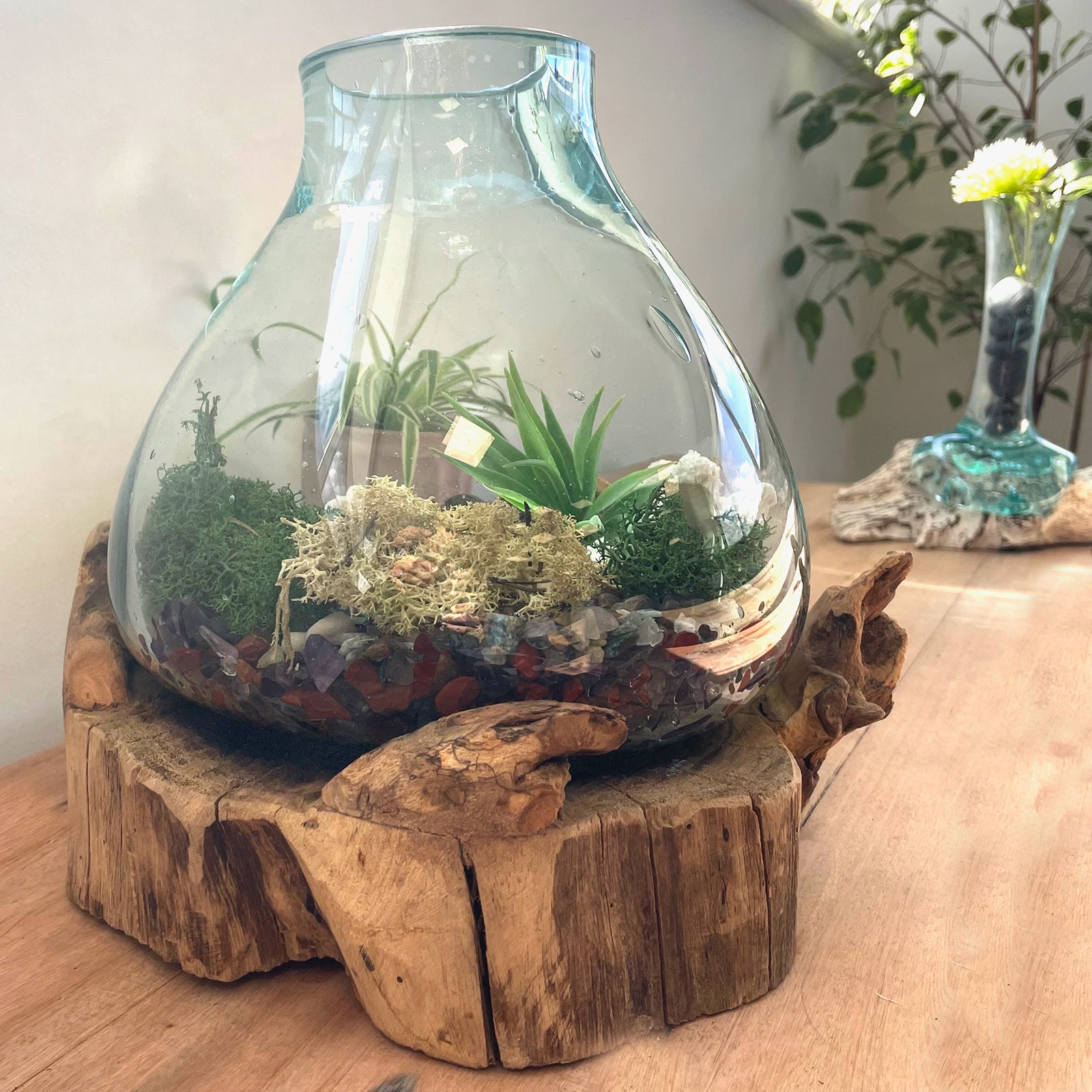 Hecha meticulosamente a mano, cada pecera es única, con un vidrio fundido que sobre un tronco de madera ofrece un espectáculo visual inigualable. Sus dimensiones generosas permiten crear un oasis acuático personalizado, ideal para peces pequeños o para ensalzar cualquier rincón como un espacio de calma y belleza.