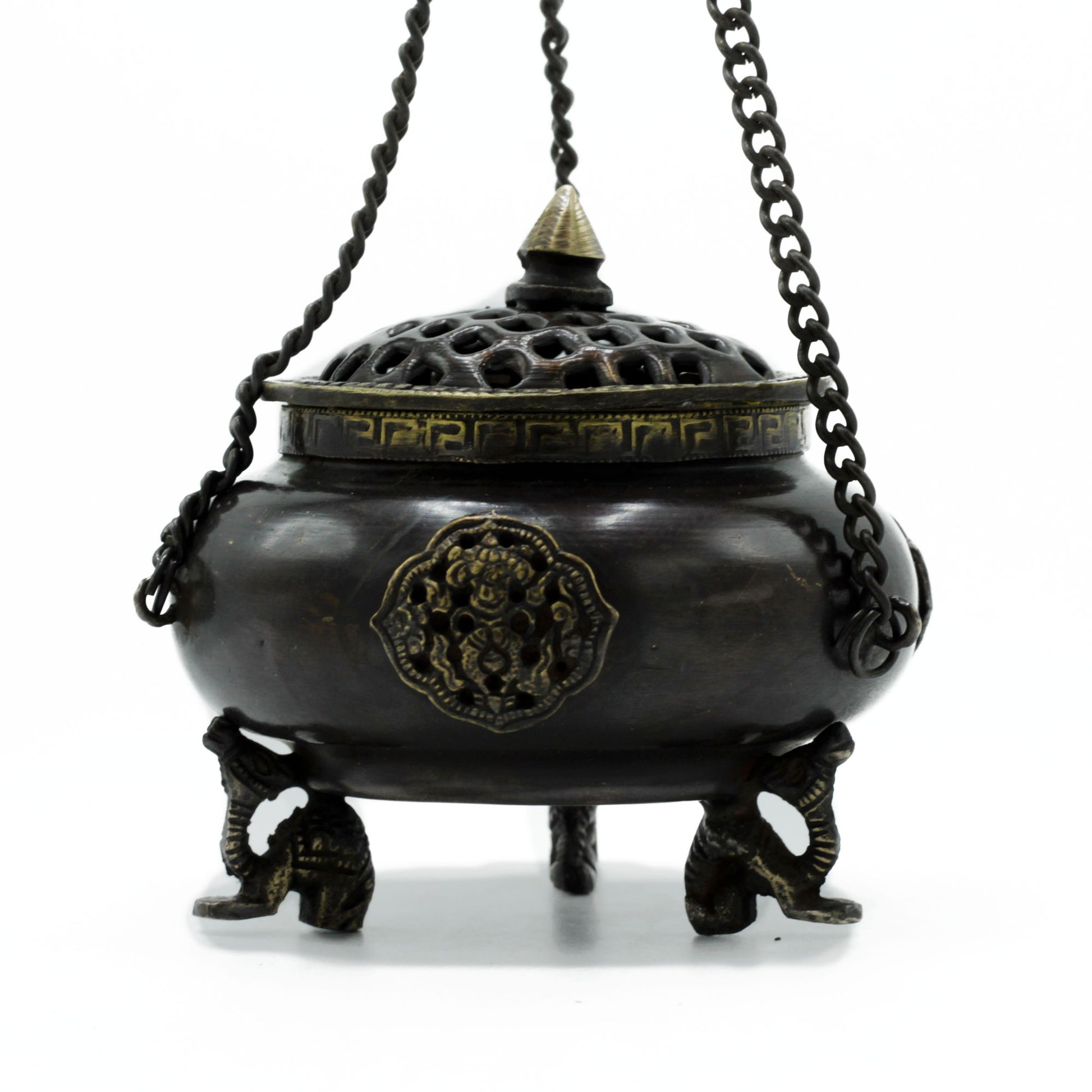 Quemador Tibetano Grande de Latón - Vasija Colgante de Cuatro Símbolos