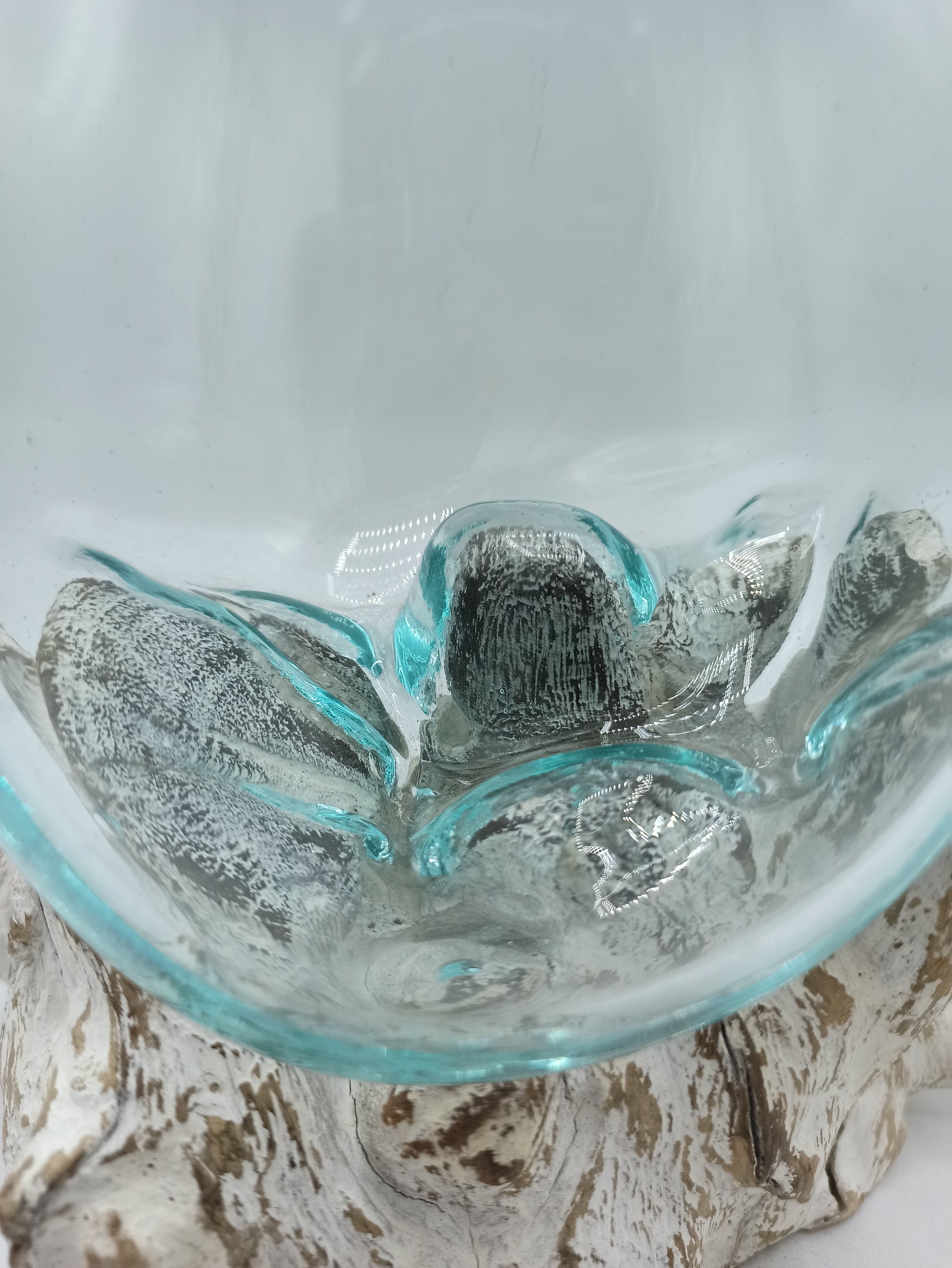 Mostrando una fusión perfecta entre elementos orgánicos y artísticos, el Vidrio fundido sobre madera blanqueada - Tazón mediano se presenta como una pieza central ideal para mesas de comedor, consolas de entrada o cualquier espacio que merezca un acento de belleza natural y diseño innovador.